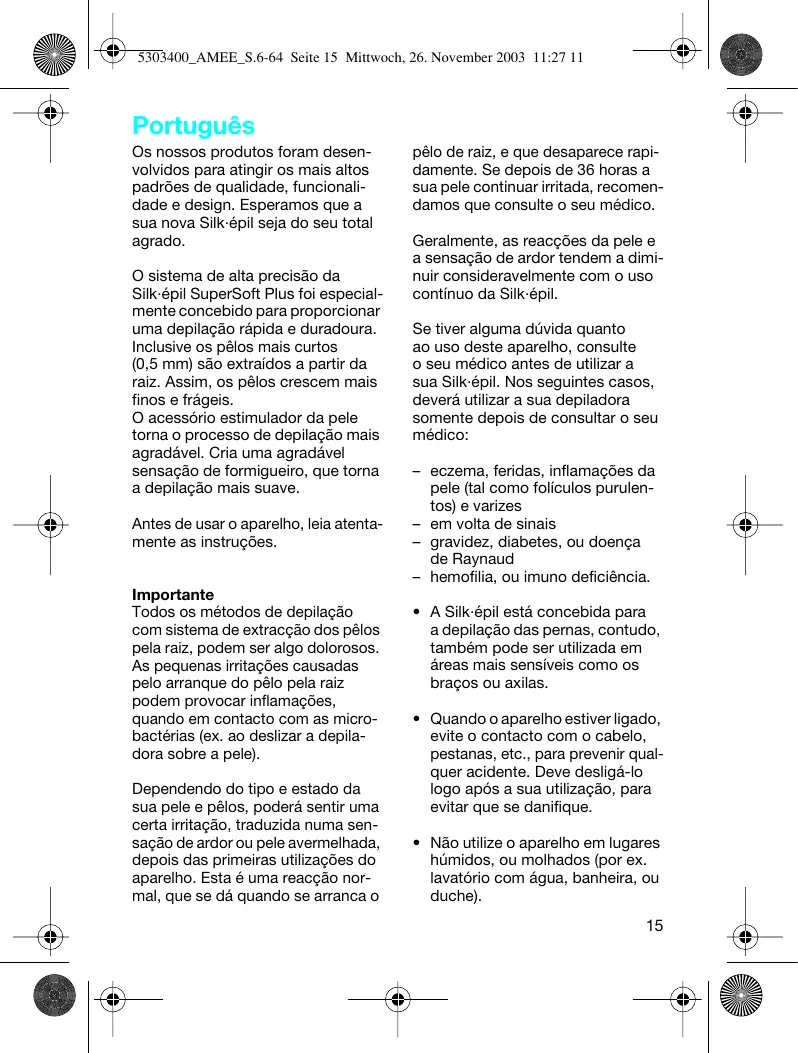 Modificaciones reservadas. Este producto cumple con las normas de Compatibilidad Electromagnética (CEM) establecidas por la Directiva del Consejo 89/336 de la CE y con la Regulación de Baja Tensión 73/23 de la CE. 5303400_AMEE_S.6-64 Seite 15 Mittwoch, 26. November 2003 11:27 11 Português Os nossos produtos foram desenvolvidos para atingir os mais altos padrões de qualidade, funcionalidade e design. Esperamos que a sua nova Silk·épil seja do seu total agrado. O sistema de alta precisão da Silk·épil SuperSoft Plus foi especialmente concebido para proporcionar uma depilação rápida e duradoura. Inclusive os pêlos mais curtos (0,5 mm) são extraídos a partir da raiz. Assim, os pêlos crescem mais finos e frágeis. O acessório estimulador da pele torna o processo de depilação mais agradável. Cria uma agradável sensação de formigueiro, que torna a depilação mais suave. Antes de usar o aparelho, leia atentamente as instruções. Importante Todos os métodos de depilação com sistema de extracção dos pêlos pela raiz, podem ser algo dolorosos. As pequenas irritações causadas pelo arranque do pêlo pela raiz podem provocar inflamações, quando em contacto com as microbactérias (ex. ao deslizar a depiladora sobre a pele). Dependendo do tipo e estado da sua pele e pêlos, poderá sentir uma certa irritação, traduzida numa sensação de ardor ou pele avermelhada, depois das primeiras utilizações do aparelho. Esta é uma reacção normal, que se dá quando se arranca o pêlo de raiz, e que desaparece rapidamente. Se depois de 36 horas a sua pele continuar irritada, recomendamos que consulte o seu médico. Geralmente, as reacções da pele e a sensação de ardor tendem a diminuir consideravelmente com o uso contínuo da Silk·épil. Se tiver alguma dúvida quanto ao uso deste aparelho, consulte o seu médico antes de utilizar a sua Silk·épil. Nos seguintes casos, deverá utilizar a sua depiladora somente depois de consultar o seu médico: – eczema, feridas, inflamações da pele (tal como folículos purulentos) e varizes – em volta de sinais – gravidez, diabetes, ou doença de Raynaud – hemofilia, ou imuno deficiência.