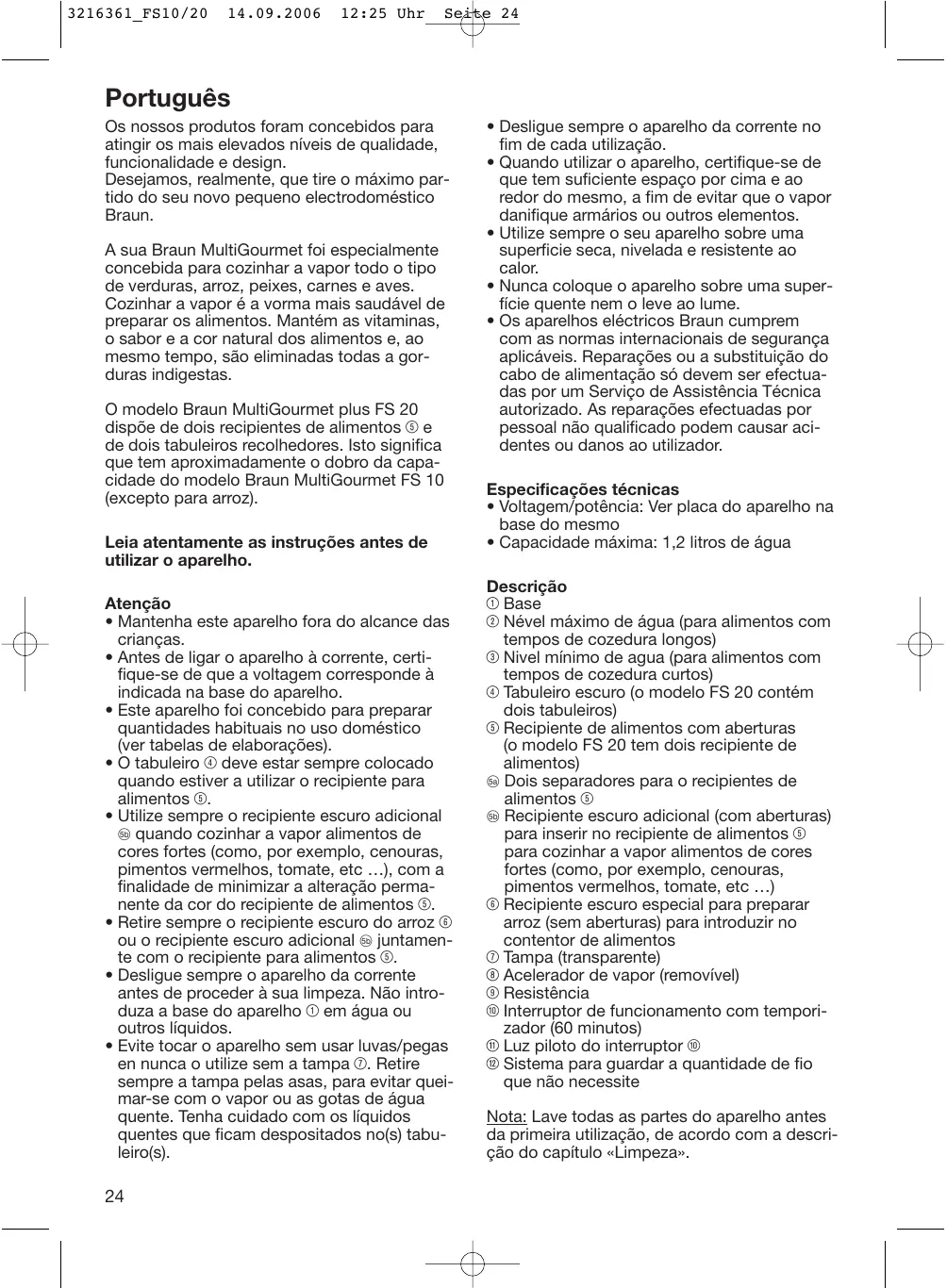 12:25 Uhr Seite 24 Português Os nossos produtos foram concebidos para atingir os mais elevados níveis de qualidade, funcionalidade e design. Desejamos, realmente, que tire o máximo partido do seu novo pequeno electrodoméstico Braun. A sua Braun MultiGourmet foi especialmente concebida para cozinhar a vapor todo o tipo de verduras, arroz, peixes, carnes e aves. Cozinhar a vapor é a vorma mais saudável de preparar os alimentos. Mantém as vitaminas, o sabor e a cor natural dos alimentos e, ao mesmo tempo, são eliminadas todas a gorduras indigestas. O modelo Braun MultiGourmet plus FS 20 dispõe de dois recipientes de alimentos 5 e de dois tabuleiros recolhedores. Isto significa que tem aproximadamente o dobro da capacidade do modelo Braun MultiGourmet FS 10 (excepto para arroz). Leia atentamente as instruções antes de utilizar o aparelho. Atenção