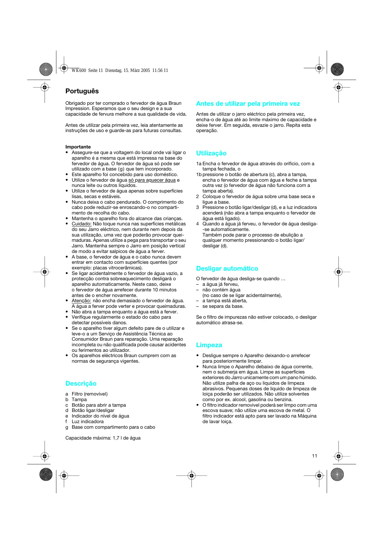 WK600 Seite 11 Dienstag, 15. März 2005 11:56 11 Português Obrigado por ter comprado o fervedor de água Braun Impression. Esperamos que o seu design e a sua capacidade de fervura melhore a sua qualidade de vida. Antes de utilizar pela primeira vez, leia atentamente as instruções de uso e guarde-as para futuras consultas. Antes de utilizar pela primeira vez Antes de utilizar o jarro eléctrico pela primeira vez, encha-o de água até ao limite máximo de capacidade e deixe ferver. Em seguida, esvazie o jarro. Repita esta operação. Importante