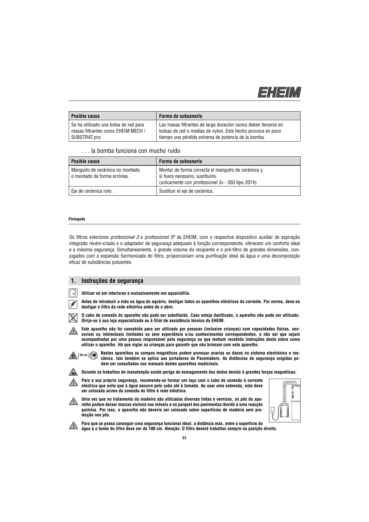 Os filtros exterioros professionnel 3 e professionnel 3^e da EHEIM, com o respective dispositoivo auxiliar de aspiracao integrado recentem-criado e o adaptador de seguranca adequado a funcao correspondente, oferecem um comforts ideal e a maxima seguranca. Simultaneamente, o grande volume do recipiente e o pre-filto de grandes dimensoes, conjugados com a expansao harmonizada do filtro, proportionam uma purificacao ideal da agua e uma decomposicao eficaz de substancias polentes.