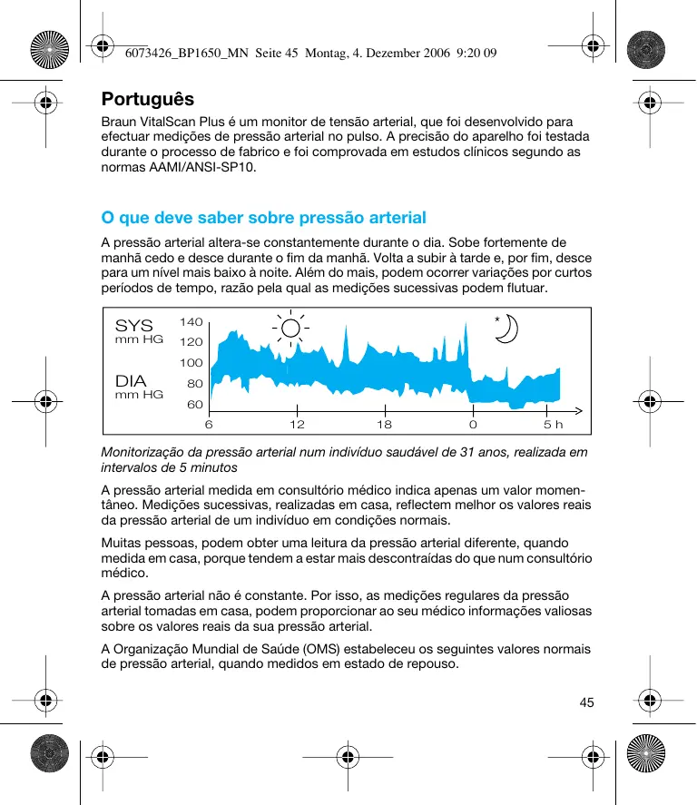 6073426_BP1650_MN Seite 45 Montag, 4. Dezember 2006 9:20 09 Português Braun VitalScan Plus é um monitor de tensão arterial, que foi desenvolvido para efectuar medições de pressão arterial no pulso. A precisão do aparelho foi testada durante o processo de fabrico e foi comprovada em estudos clínicos segundo as normas AAMI/ANSI-SP10. O que deve saber sobre pressão arterial A pressão arterial altera-se constantemente durante o dia. Sobe fortemente de manhã cedo e desce durante o fim da manhã. Volta a subir à tarde e, por fim, desce para um nível mais baixo à noite. Além do mais, podem ocorrer variações por curtos períodos de tempo, razão pela qual as medições sucessivas podem flutuar. SYS