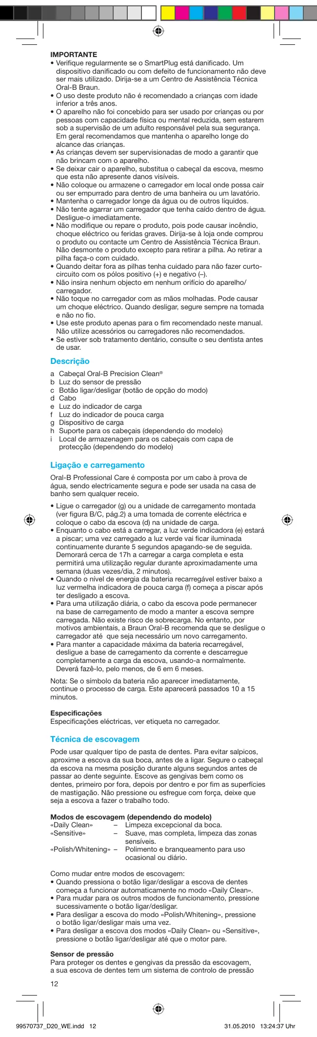 - No entanto, todos os outros elementos (base de suporte, local de armazenagem para os cabeçais e capa protectora) podem ser colocados na máquina de lavar loiça. Sujeito a alterações sem aviso prévio. Este produto contém baterias recarregáveis. No entanto, com o objectivo de proteger o ambiente, no final da vida útil do produto, por favor, não o deite fora no lixo doméstico. Pode entregá-lo num Centro de Assistência da Braun ou num dos pontos de entrega aprovados para reciclagem, de acordo com a legislação local ou nacional. Garantia Os nossos produtos dispõem de uma garantia de 2 anos após a data da aquisição. Qualquer defeito do aparelho imputável, quer aos materiais, quer ao fabrico, que torne necessário, de acordo com o critério da Braun, reparar, substituir peças ou trocar de aparelho, dentro do período de garantia, não terá custos adicionais. Esta garantia é extensível a todos os países onde este aparelho seja fornecido pela Braun ou pelo seu distribuidor licenciado. Esta garantia não contempla: avarias provocadas por uso indevido, desgaste normal na utilização (especialmente no que concerne às recargas), bem como defeitos que causem diminuição do seu valor ou do funcionamento do aparelho. Esta garantia torna-se inválida no caso das reparações serem efectuadas por pessoas não autorizadas ou quando sejam utilizadas peças ou acessórios não originais da Braun. Em caso de reclamação, contemplada por esta garantia, entregue o aparelho completo ou envie-o, juntamente com o talão de compra original, para os Serviços de Assistência Técnica da Braun. Para o Reino Unido – A presente garantia não afecta os direitos conferidos pela garantia legal. O desafio de 30 dias Experimente a Oral-B Professional Care desde o dia da compra. Se não sentir os seus dentes mais limpos, devolva por favor o cabo da escova, o conjunto de recargas e a base de carregamento com o seu talão de compra original para a morada a seguir indicada, num prazo de 30 dias. Portugal: «Garantia Satisfação 30 dias» Apartado 1181 2781-801 Paço de Arcos Para mais informações, contacte por favor a nossa Linha de Apoio ao Consumidor para que lhe seja indicado o Centro de Assistência Técnica autorizado da Braun mais próximo de si. Italiano Oral-B® Professional Care è studiato con la massima cura per offrire a te e alla tua famiglia la nostra esperienza unica, altamente sicura ed efficace. IMPORTANTE