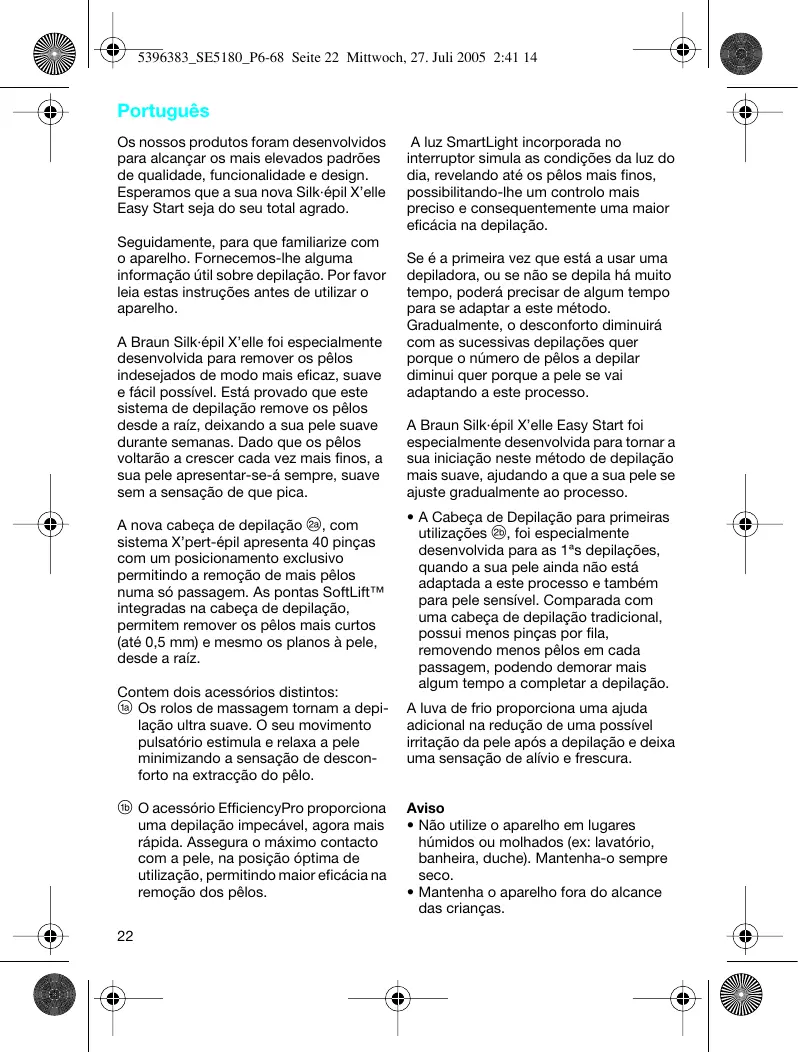 5396383_SE5180_P6-68 Seite 22 Mittwoch, 27. Juli 2005 2:41 14 Português Os nossos produtos foram desenvolvidos para alcançar os mais elevados padrões de qualidade, funcionalidade e design. Esperamos que a sua nova Silk·épil X’elle Easy Start seja do seu total agrado. Seguidamente, para que familiarize com o aparelho. Fornecemos-lhe alguma informação útil sobre depilação. Por favor leia estas instruções antes de utilizar o aparelho. A Braun Silk·épil X’elle foi especialmente desenvolvida para remover os pêlos indesejados de modo mais eficaz, suave e fácil possível. Está provado que este sistema de depilação remove os pêlos desde a raíz, deixando a sua pele suave durante semanas. Dado que os pêlos voltarão a crescer cada vez mais finos, a sua pele apresentar-se-á sempre, suave sem a sensação de que pica. A nova cabeça de depilação B, com sistema X’pert-épil apresenta 40 pinças com um posicionamento exclusivo permitindo a remoção de mais pêlos numa só passagem. As pontas SoftLift™ integradas na cabeça de depilação, permitem remover os pêlos mais curtos (até 0,5 mm) e mesmo os planos à pele, desde a raíz. Contem dois acessórios distintos: A Os rolos de massagem tornam a depilação ultra suave. O seu movimento pulsatório estimula e relaxa a pele minimizando a sensação de desconforto na extracção do pêlo. a O acessório EfficiencyPro proporciona uma depilação impecável, agora mais rápida. Assegura o máximo contacto com a pele, na posição óptima de utilização, permitindo maior eficácia na remoção dos pêlos.