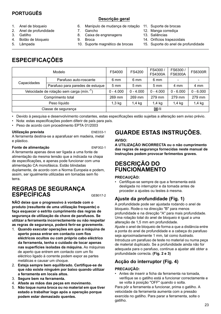 ESPECIFICAÇÔES FS4300 / | FS6300 / Modelo FS4000 | FS4200 | ÉSéaoon | r863004 | FS8300R Parafuso auto-roscante 6mm 6 mm 6 mm - = Capacidades Parafuso para paredes de estuque | 5 mm 5mm 5mm 4 mm 4 mm Velocidade de rotaçäo sem carga (min?) 0-4.000 | 0-4.000 | 0-4000 | 0-6.000 | 0-6.000 Comprimento total 269 mm | 269 mm | 279mm | 279mm | 279mm Peso liquido 13kg 14kg 14kg 14kg 14kg Classe de segurança Et + Devido à pesquisa e desenvolvimento constantes, estas especificaçües estäo sujeitas a alteraçäo sem aviso prévio + Nota: estas especificagôes podem diferir de pais para pais. +_ Peso de acordo com procedimento EPTA 01/2003 Utilizaçäo prevista ENE033-1 A ferramenta destina-se a aparafusar em madeira, metal e pléstico. Fonte de alimentaçäo ENFO02-1 A ferramenta apenas deve ser ligada a uma fonte de alimentaçäo da mesma tensäo que a indicada na chapa de especificagôes, e apenas pode funcionar com uma alimentaçäo CA monofäsica. Estäo blindadas duplamente, de acordo com a Norma Europeia e podem, assim, ser igualmente utilizadas em tomadas sem fio terra
