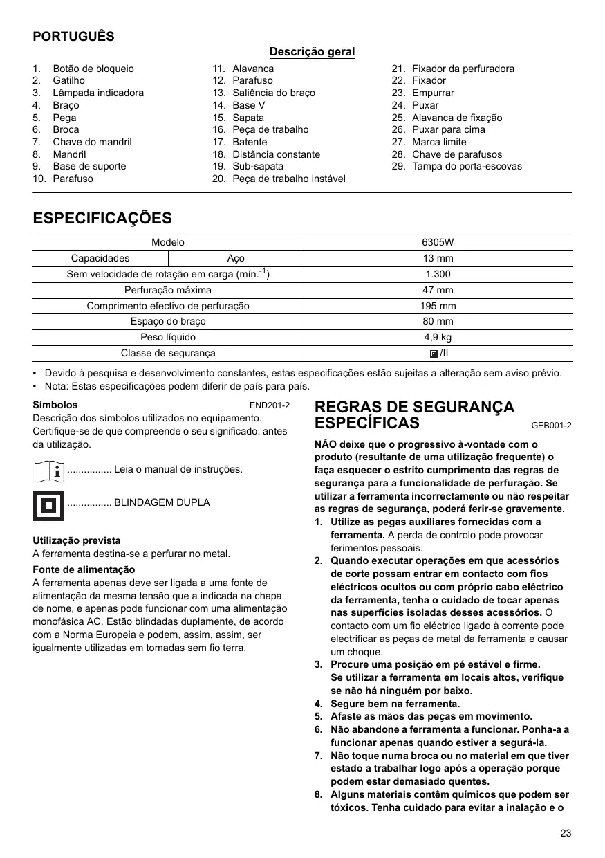 - Nota: Estas especificações podem diferir de país para país. END201-2 Símbolos Descrição dos símbolos utilizados no equipamento. Certifique-se de que compreende o seu significado, antes da utilização. ................ Leia o manual de instruções. ................ BLINDAGEM DUPLA Utilização prevista A ferramenta destina-se a perfurar no metal. Fonte de alimentação A ferramenta apenas deve ser ligada a uma fonte de alimentação da mesma tensão que a indicada na chapa de nome, e apenas pode funcionar com uma alimentação monofásica AC. Estão blindadas duplamente, de acordo com a Norma Europeia e podem, assim, assim, ser igualmente utilizadas em tomadas sem fio terra.