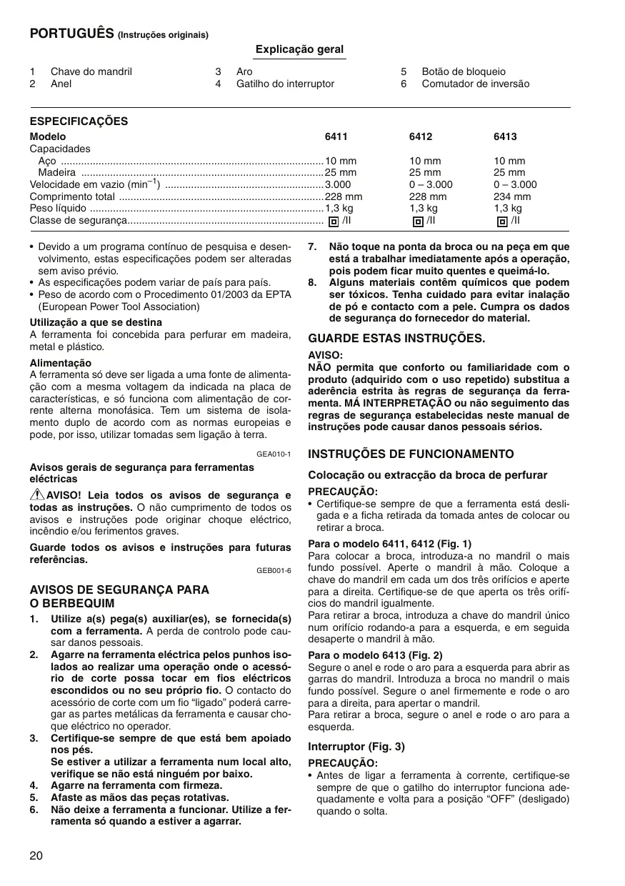 PORTUGUËS (Instruçôes originais) Explicaçäo geral 1 Chave do mandril 3 Aro 5 Botäo de bloqueio 2 Anel 4 Gatiho do interruptor 6 Comutador de inversäo ESPECIFICAÇOES Modelo 6a11 6412 6413 Capacidades AGO mu 10 mm 10 mm 10 mm Madeira . . 25 mm 25 mm 25 mm Velocidade em vazio (min 3.000 0- 3.000 03.000 Comprimento total 228 mm 228 mm 234 mm Peso liquido . . 1,3kg 13kg 1,3kg Classe de segurança.. Œ/i Œ/i Œ/i + Devido a um programa continuo de pesquisa e desen- volvimento, estas especificaçôes podem ser alteradas sem aviso prévio. + As especificaçôes podem variar de pais para pais. + Peso de acordo com o Procedimento 01/2003 da EPTA (European Power Tool Association) Utilizaçäo a que se destina A ferramenta foi concebida para perfurar em madeira, metal e pléstico. Alimentaçäo A ferramenta s6 deve ser ligada a uma fonte de alimenta- çgäo com a mesma voltagem da indicada na placa de caracteristicas, e s funciona com alimentaçäo de cor- rente alterna monoésica. Tem um sistema de isola- mento duplo de acordo com as normas europeias e pode, por isso, utilizar tomadas sem ligaçäo à terra. GEaoto4 Avisos gerais de segurança para ferramentas eléctricas ANAVISO! Leia todos os avisos de segurança e todas as instruçôes. O näâo cumprimento de todos os avisos e instruçôes pode originar choque eléctrico, incéndio e/ou ferimentos graves. Guarde todos os avisos e instruçôes para futuras referéncias. GEoors