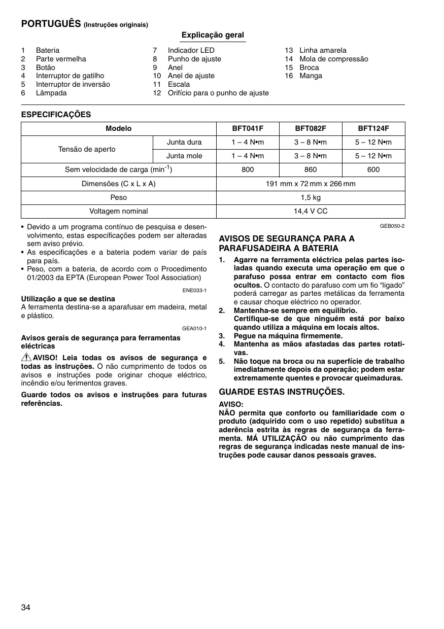 GEA010-1 Agarre na ferramenta eléctrica pelas partes isoladas quando executa uma operação em que o parafuso possa entrar em contacto com fios ocultos. O contacto do parafuso com um fio “ligado” poderá carregar as partes metálicas da ferramenta e causar choque eléctrico no operador. Mantenha-se sempre em equilíbrio. Certifique-se de que ninguém está por baixo quando utiliza a máquina em locais altos. Pegue na máquina firmemente. Mantenha as mãos afastadas das partes rotativas. Não toque na broca ou na superfície de trabalho imediatamente depois da operação; podem estar extremamente quentes e provocar queimaduras. Avisos gerais de segurança para ferramentas eléctricas