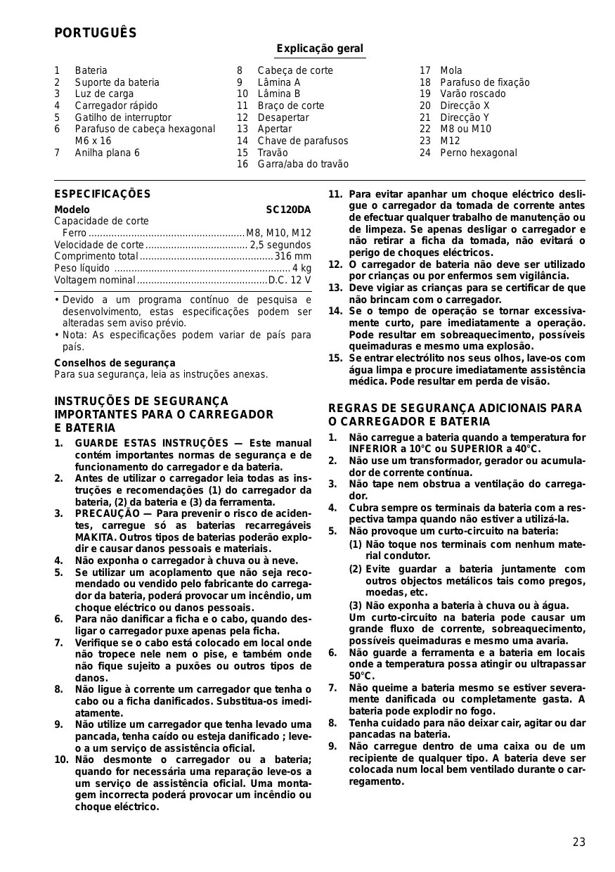 Cabeça de corte Lâmina A Lâmina B Braço de corte Desapertar Apertar Chave de parafusos Travão Garra/aba do travão ESPECIFICAÇÕES Modelo SC120DA Capacidade de corte Ferro ....................................................... M8, M10, M12 Velocidade de corte .................................... 2,5 segundos Comprimento total ............................................... 316 mm Peso líquido .............................................................. 4 kg Voltagem nominal ..............................................D.C. 12 V