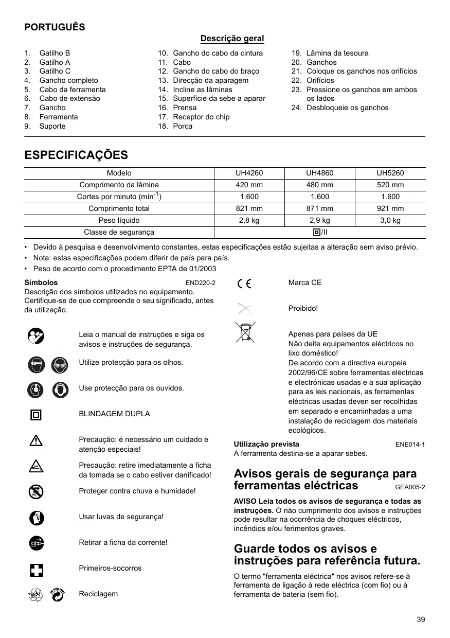 - Peso de acordo com o procedimento EPTA de 01/2003 END220-2 Símbolos Descrição dos símbolos utilizados no equipamento. Certifique-se de que compreende o seu significado, antes da utilização. Leia o manual de instruções e siga os avisos e instruções de segurança. Utilize protecção para os olhos. Use protecção para os ouvidos. BLINDAGEM DUPLA Precaução: é necessário um cuidado e atenção especiais! Precaução: retire imediatamente a ficha da tomada se o cabo estiver danificado! Proteger contra chuva e humidade! Usar luvas de segurança! Retirar a ficha da corrente! Primeiros-socorros Reciclagem Marca CE Proibido! Apenas para países da UE Não deite equipamentos eléctricos no lixo doméstico! De acordo com a directiva europeia 2002/96/CE sobre ferramentas eléctricas e electrónicas usadas e a sua aplicação para as leis nacionais, as ferramentas eléctricas usadas deven ser recolhidas em separado e encaminhadas a uma instalação de reciclagem dos materiais ecológicos. Utilização prevista A ferramenta destina-se a aparar sebes. ENE014-1 Avisos gerais de segurança para GEA005-2 ferramentas eléctricas AVISO Leia todos os avisos de segurança e todas as instruções. O não cumprimento dos avisos e instruções pode resultar na ocorrência de choques eléctricos, incêndios e/ou ferimentos graves. Guarde todos os avisos e instruções para referência futura. O termo "ferramenta eléctrica" nos avisos refere-se à ferramenta de ligação à rede eléctrica (com fio) ou à ferramenta de bateria (sem fio).