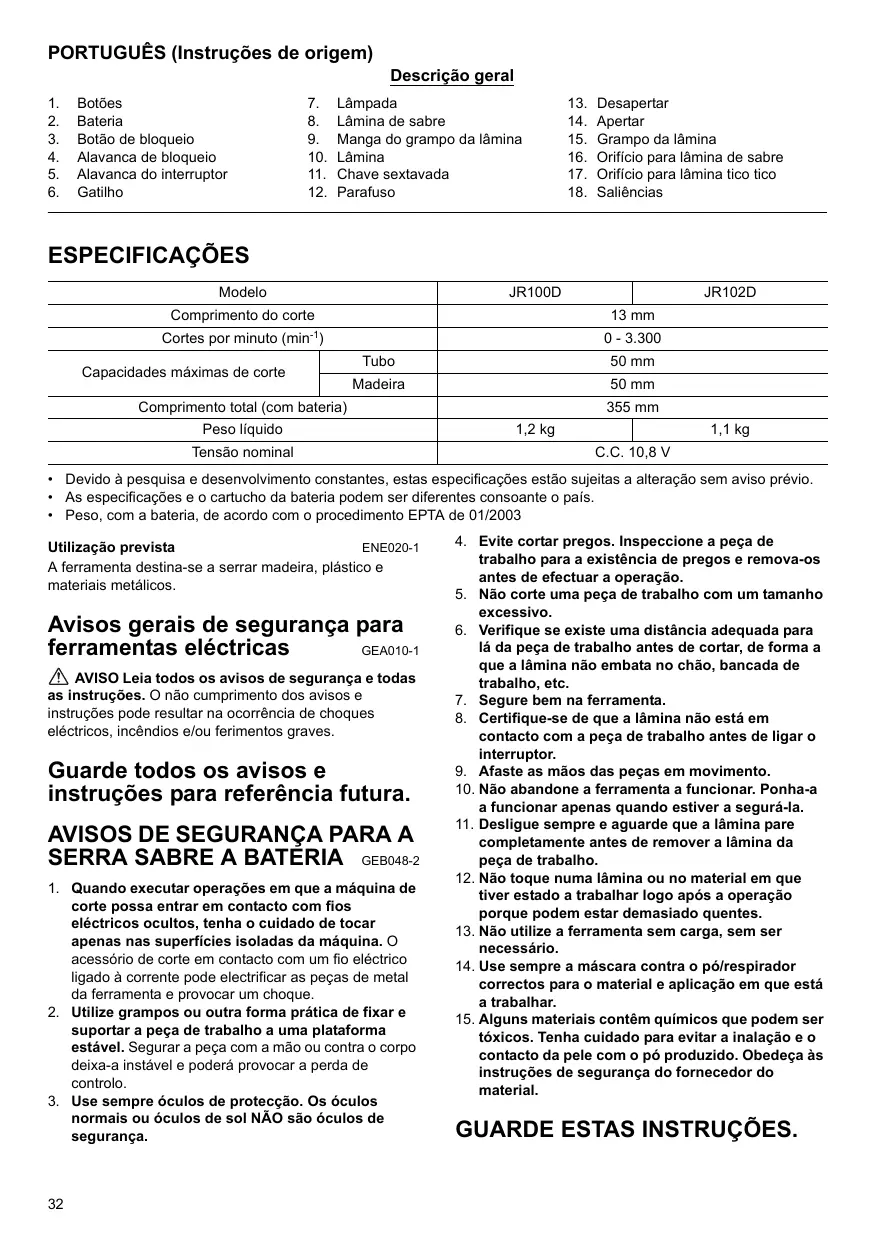 Encontre gratuitamente o manual do aparelho JR102D MAKITA em formato PDF.