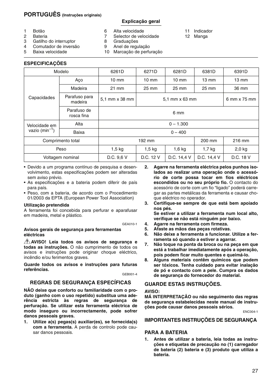 Baixe as instruções para o seu Furadeira sem fio em formato PDF gratuitamente! Encontre o seu manual 6271D - MAKITA e retome o controlo do seu dispositivo eletrónico. Nesta página estão publicados todos os documentos necessários para a utilização do seu dispositivo. 6271D da marca MAKITA.