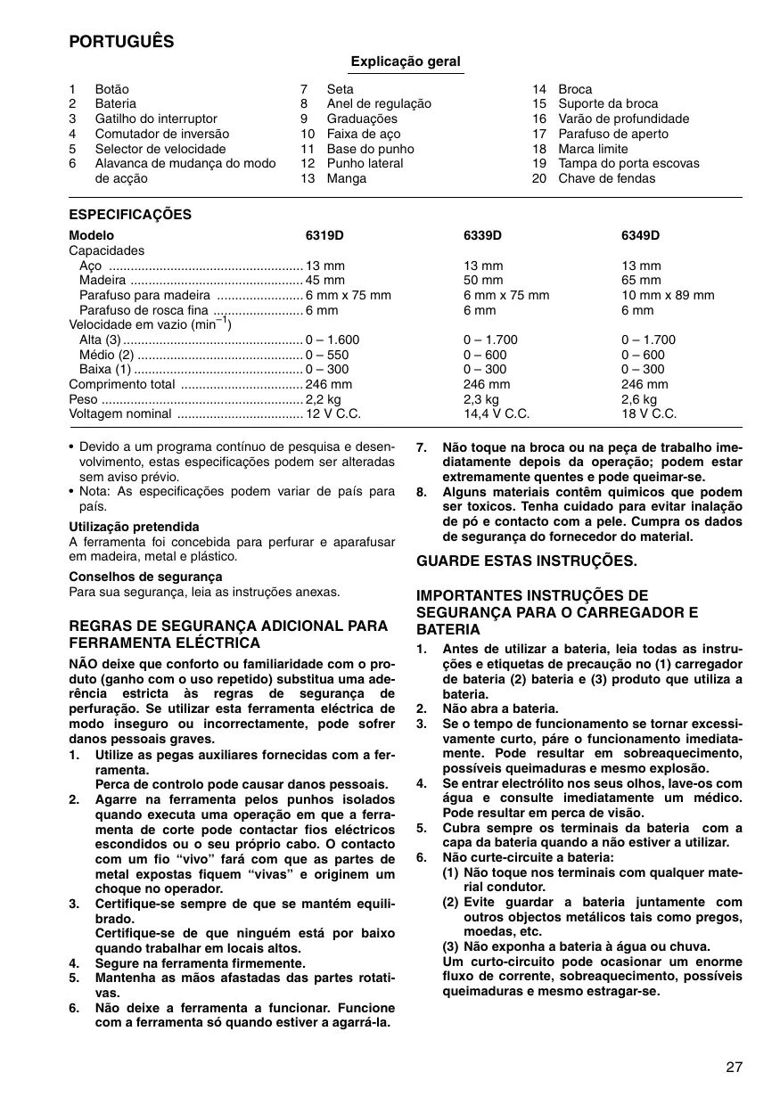 PORTUGUËS Explicaçäo geral 1 Botäo 7 Seta 14 Broca 2 Bateria 8 Anel de regulaçäo 15. Suporte da broca 3 Gatilho do interruptor 9 Graduaçôes 16. Varäo de profundidade 4 Comutador de inversäo 10 Faixa de aço 17 Parafuso de aperto 5 Selector de velocidade 11. Base do punho 18 Marca limite 6 Alavanca de mudança do modo 12. Punho lateral 19 Tampa do porta escovas de acçäo 13 Manga 20 Chave de fendas ESPECIFICAÇOES Modelo 6319D 6339D 6349D 13mm 13 mm . 50 mm 65 mm Parafuso para madeira .. 6 mm x 75 mm 6 mm x 75 mm 10 mm x 89 mm Parafuso de rosca fina 6mm 6mm Velocidade em vazio (min * Alta (3). . 0- 1.700 0-1.700 Médio (2) . 0- 600 0-600 Baixa (1 . 0- 300 0- 300 Comprimento total . 246 mm 246 mm Peso . 2,3 kg 2,6kg Voltagem nominal 14,4 V C.C. 18VC.C. + Devido a um programa continuo de pesquisa e desen- volvimento, estas especificagées podem ser alteradas sem aviso prévio. + Nota: As especificagées podem variar de pais para pais. Utilizaçäo pretendida À ferramenta foi concebida para perfurar e aparafusar em madeira, metal e plästico. Conselhos de segurança Para sua segurança, leia as instruçôes anexas.