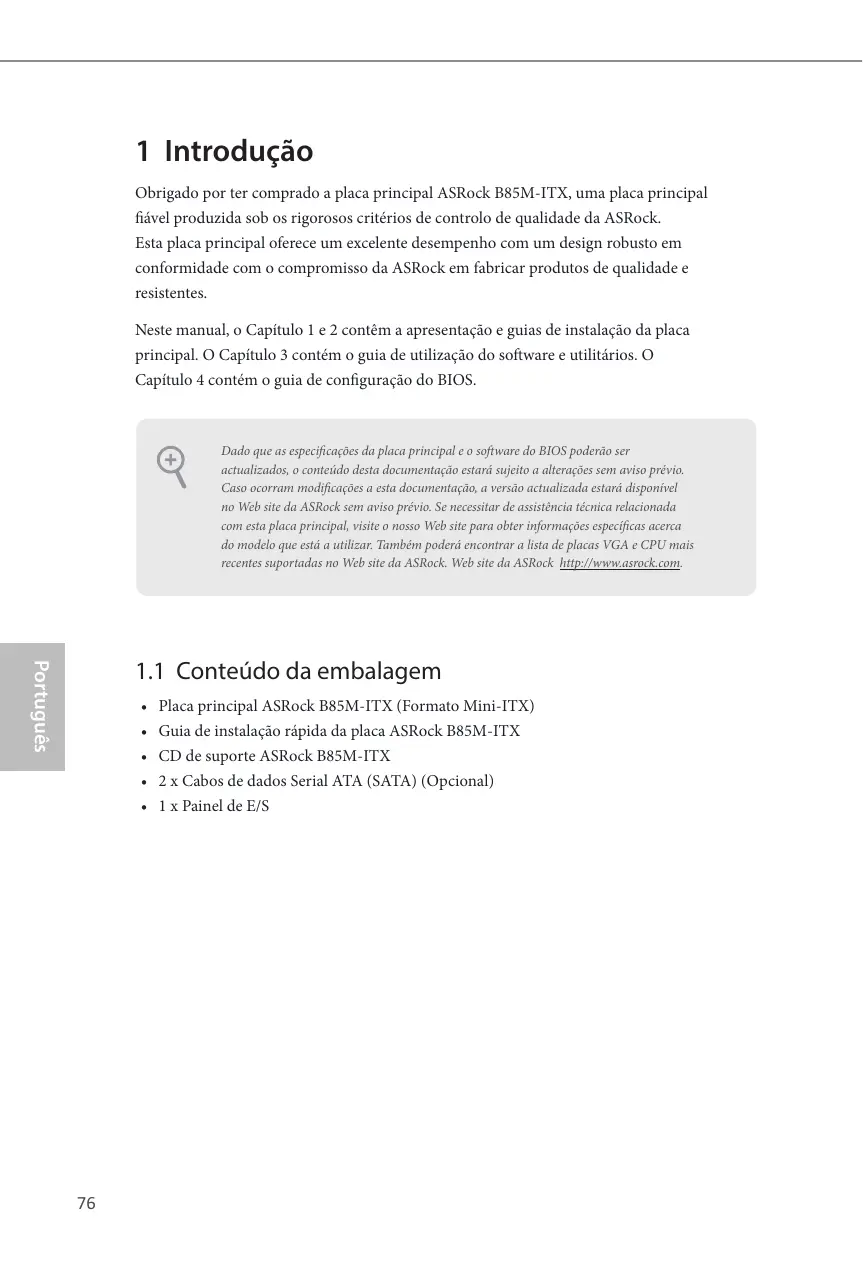 1 Introdução Obrigado por ter comprado a placa principal ASRock B85M-ITX, uma placa principal fiável produzida sob os rigorosos critérios de controlo de qualidade da ASRock. Esta placa principal oferece um excelente desempenho com um design robusto em conformidade com o compromisso da ASRock em fabricar produtos de qualidade e resistentes. Neste manual, o Capítulo 1 e 2 contêm a apresentação e guias de instalação da placa principal. O Capítulo 3 contém o guia de utilização do software e utilitários. O Capítulo 4 contém o guia de configuração do BIOS.