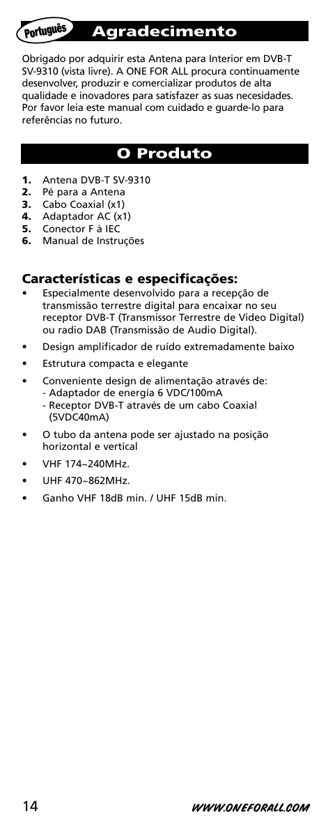 Encontre gratuitamente o manual do aparelho SV-9310 ONE FOR ALL em formato PDF.
