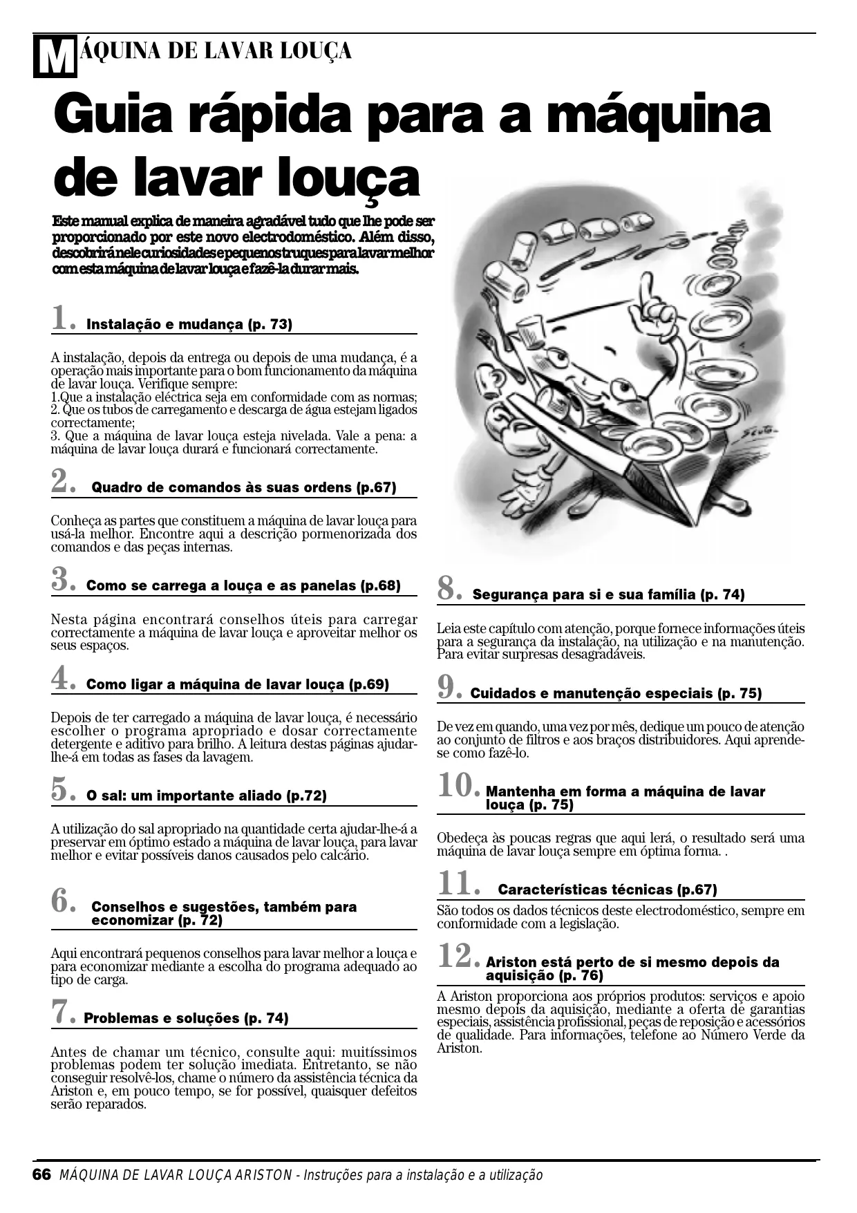 Características técnicas (p.67) São todos os dados técnicos deste electrodoméstico, sempre em conformidade com a legislação. Conselhos e sugestões, também para economizar (p. 72) Aqui encontrará pequenos conselhos para lavar melhor a louça e para economizar mediante a escolha do programa adequado ao tipo de carga.