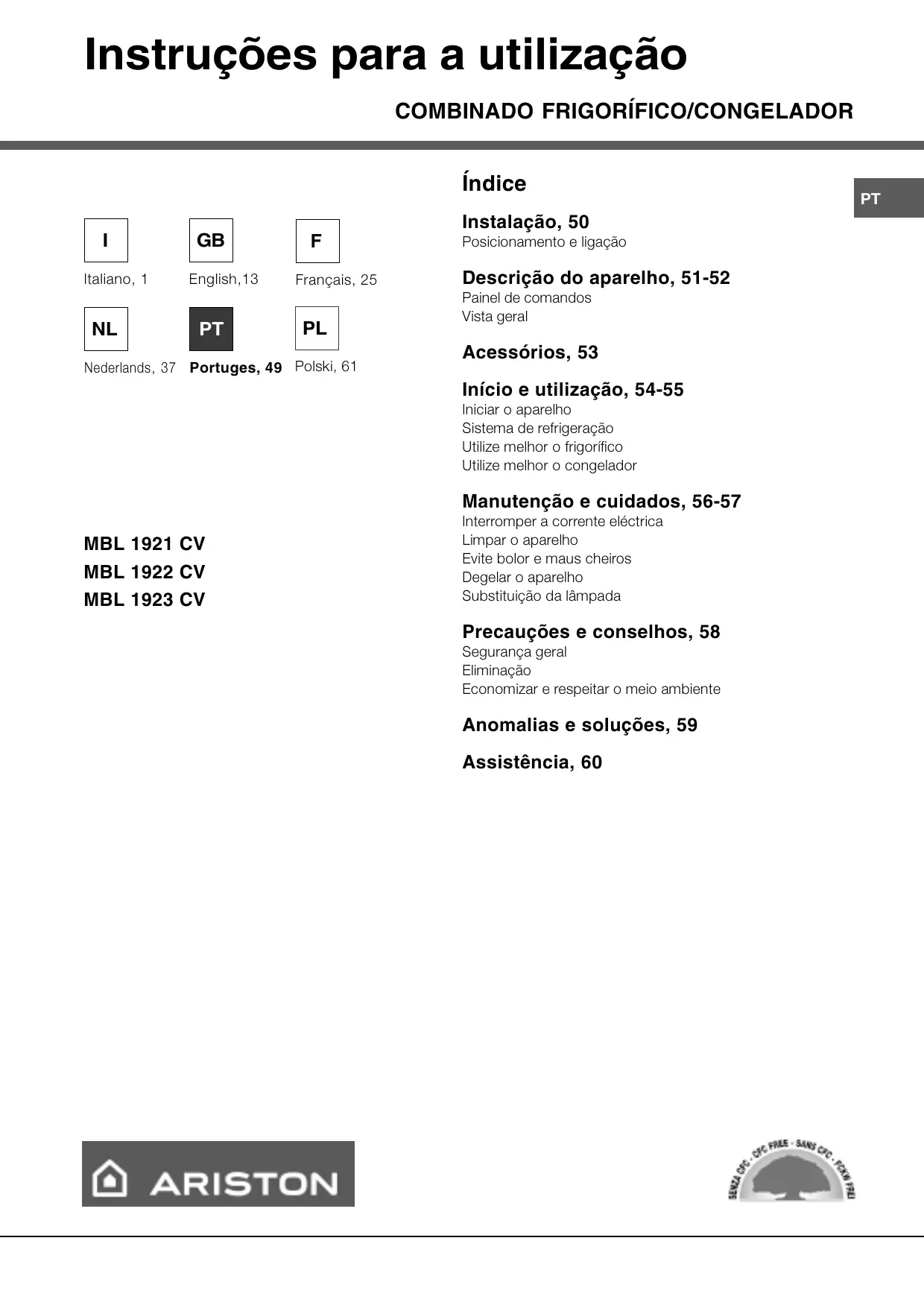 Encontre gratuitamente o manual do aparelho MBL 1922 CV HOTPOINT-ARISTON em formato PDF.