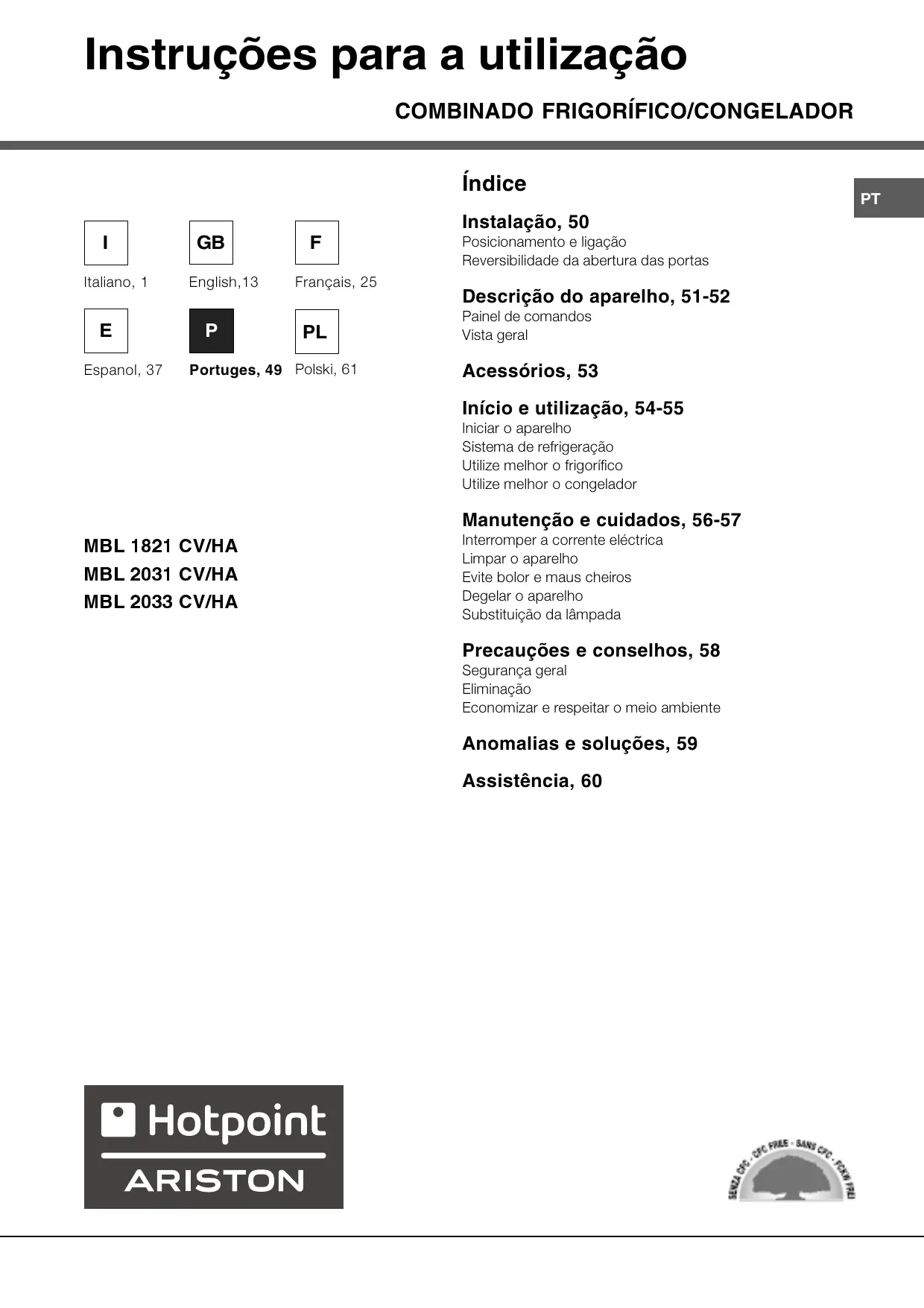 Encontre gratuitamente o manual do aparelho MBL 2031 CV HOTPOINT-ARISTON em formato PDF.
