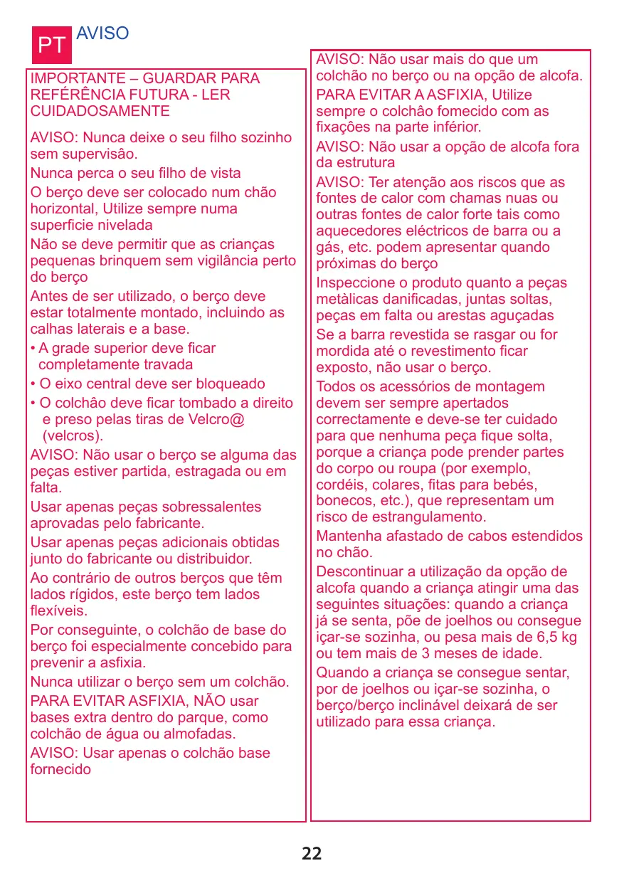 PT AVISO IMPORTANTE – GUARDAR PARA REFÉRÊNCIA FUTURA - LER CUIDADOSAMENTE AVISO: Nunca deixe o seu filho sozinho sem supervisâo. Nunca perca o seu filho de vista O berço deve ser colocado num chão horizontal, Utilize sempre numa superficie nivelada Não se deve permitir que as crianças pequenas brinquem sem vigilância perto do berço Antes de ser utilizado, o berço deve estar totalmente montado, incluindo as calhas laterais e a base. • A grade superior deve ficar completamente travada • O eixo central deve ser bloqueado • O colchâo deve ficar tombado a direito e preso pelas tiras de Velcro@ (velcros). AVISO: Não usar o berço se alguma das peças estiver partida, estragada ou em falta. Usar apenas peças sobressalentes aprovadas pelo fabricante. Usar apenas peças adicionais obtidas junto do fabricante ou distribuidor. Ao contrário de outros berços que têm lados rígidos, este berço tem lados flexíveis. Por conseguinte, o colchão de base do berço foi especialmente concebido para prevenir a asfixia. Nunca utilizar o berço sem um colchão. PARA EVITAR ASFIXIA, NÃO usar bases extra dentro do parque, como colchão de água ou almofadas. AVISO: Usar apenas o colchão base fornecido