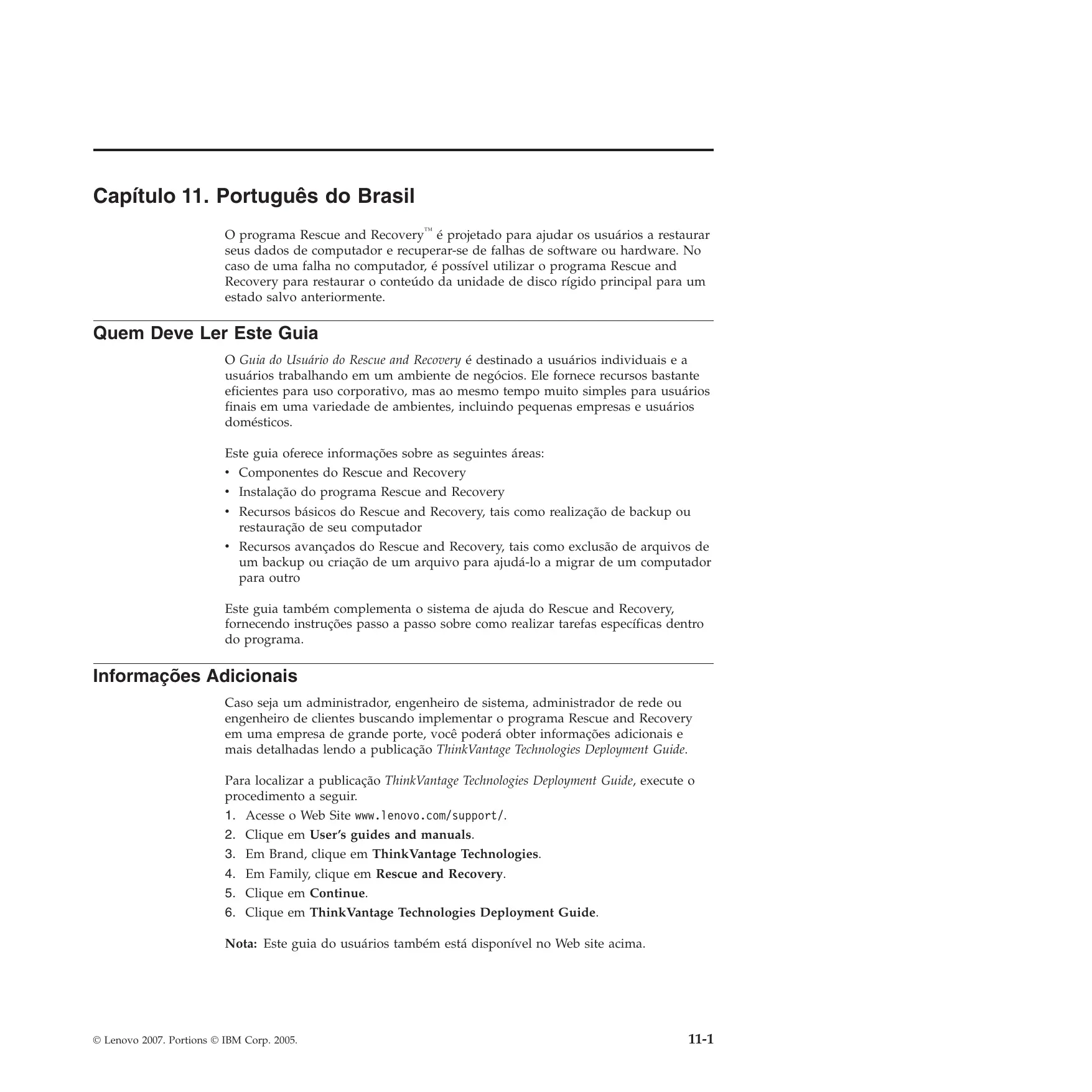 Kapitel 1. Svenska 10-9 10-10 Rescue and Recovery™ Användarhandbok Capítulo 11. Português do Brasil O programa Rescue and Recovery™ é projetado para ajudar os usuários a restaurar seus dados de computador e recuperar-se de falhas de software ou hardware. No caso de uma falha no computador, é possível utilizar o programa Rescue and Recovery para restaurar o conteúdo da unidade de disco rígido principal para um estado salvo anteriormente. Quem Deve Ler Este Guia O Guia do Usuário do Rescue and Recovery é destinado a usuários individuais e a usuários trabalhando em um ambiente de negócios. Ele fornece recursos bastante eficientes para uso corporativo, mas ao mesmo tempo muito simples para usuários finais em uma variedade de ambientes, incluindo pequenas empresas e usuários domésticos. Este guia oferece informações sobre as seguintes áreas: v Componentes do Rescue and Recovery v Instalação do programa Rescue and Recovery v Recursos básicos do Rescue and Recovery, tais como realização de backup ou restauração de seu computador v Recursos avançados do Rescue and Recovery, tais como exclusão de arquivos de um backup ou criação de um arquivo para ajudá-lo a migrar de um computador para outro Este guia também complementa o sistema de ajuda do Rescue and Recovery, fornecendo instruções passo a passo sobre como realizar tarefas específicas dentro do programa. Informações Adicionais Caso seja um administrador, engenheiro de sistema, administrador de rede ou engenheiro de clientes buscando implementar o programa Rescue and Recovery em uma empresa de grande porte, você poderá obter informações adicionais e mais detalhadas lendo a publicação ThinkVantage Technologies Deployment Guide. Para localizar a publicação ThinkVantage Technologies Deployment Guide, execute o procedimento a seguir.