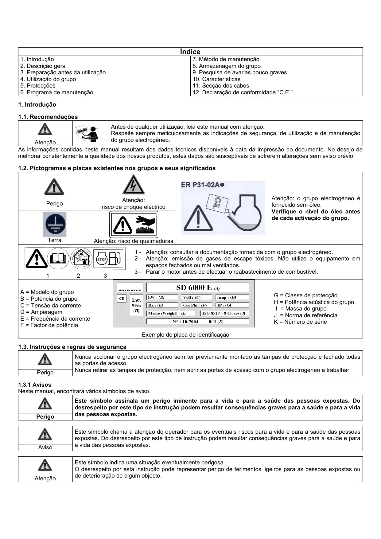 Manuel d'utilisation et d'entretien (Notice originale) 1.2. Pictogrammes et plaquettes figurant sur les groupes avec leur signification