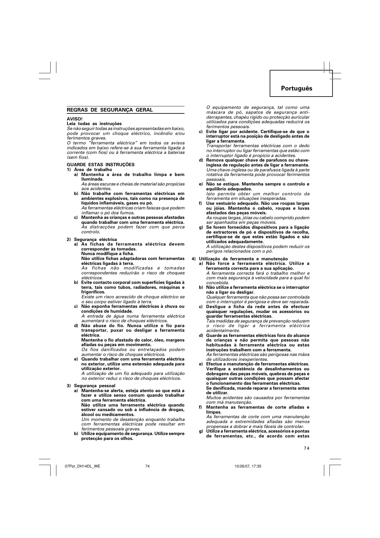 10/26/07, 17:35 Português GARANTIA Garantimos que a Hitachi Power Tools obedece às respectivas normas específicas estatutárias/de país. Esta garantia não cobre avarias ou danos derivados de má utilização, abuso ou desgaste normal. Em caso de queixa, envie a Ferramenta, não desmontada, juntamente com o CERTIFICADO DE GARANTIA que se encontra no fundo destas instruções de utilização, para um Centro de Serviço Autorizado Hitachi. NOTA: Devido ao contínuo programa de pesquisa e desenvolvimento da HITACHI, as especificações aqui contidas estão sujeitas a mudanças sem aviso prévio. Informação a respeito de ruídos e vibração do ar Os valores medidos foram determinados de acordo com a EN60745 e declarados em conformidade com a ISO