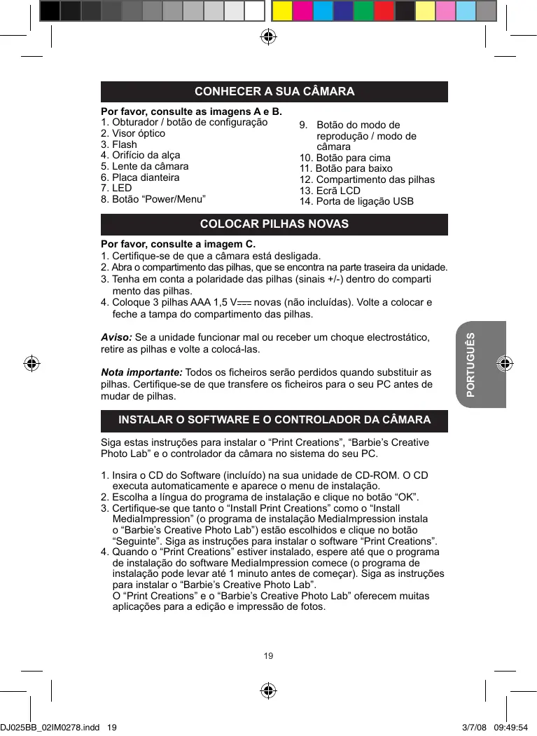 novas (não incluídas). Volte a colocar e feche a tampa do compartimento das pilhas. INSTALAR O SOFTWARE E O CONTROLADOR DA CÂMARA Siga estas instruções para instalar o “Print Creations”, “Barbie’s Creative Photo Lab” e o controlador da câmara no sistema do seu PC.