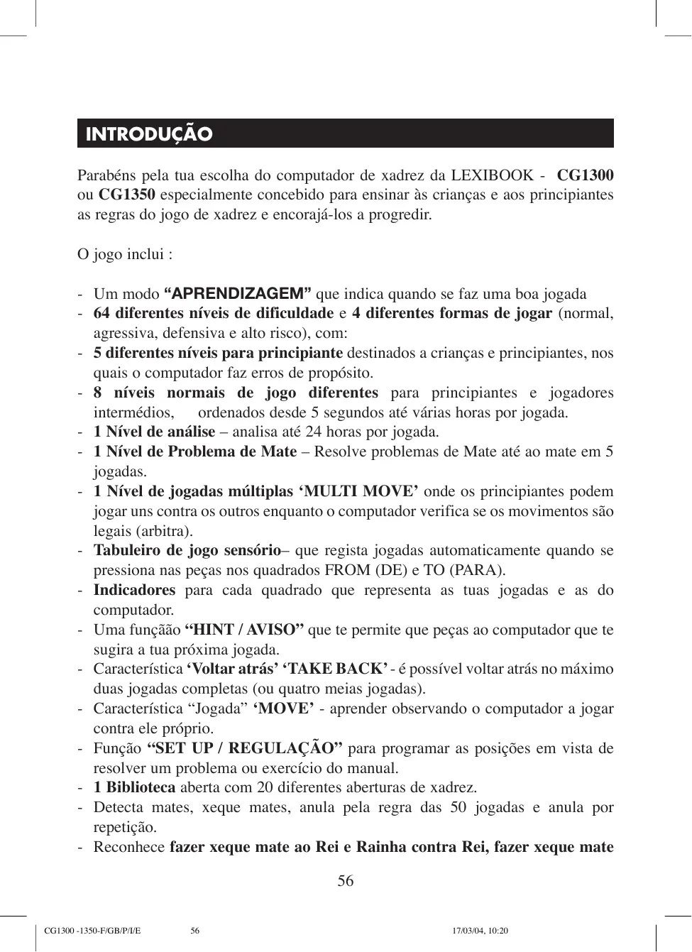 • 64 niveaux de difficulté répartis en 4 styles de jeu différents (normal, agressif, défensif et aléatoire) et comprenant : 5 niveaux ‘débutants’ destinés aux enfants et aux joueurs débutants dans lesquels l’ordinateur sacrifie des pièces délibérément 8 niveaux de jeu normaux pour joueurs débutants à confirmés avec des temps de réponse allant de 5 secondes à plusieurs heures 1 niveau d’analyse qui analyse la position jusqu’à 24 heures durant 1 niveau ‘MAT’ destiné à résoudre des problèmes de mat jusqu’au mat en 5 coups 1 niveau ‘MULTI MOVE’ permettant à deux joueurs de jouer l’un contre l’autre tandis que l’ordinateur joue un rôle d’arbitre. • un plateau de jeu sensitif qui enregistre automatiquement votre déplacement lorsque vous appuyez sur la case d’origine et sur la case d’arrivée du coup. • des voyants indiquant les coordonnées de vos coups et de ceux de l’ordinateur. • une fonction ‘HINT’ par laquelle vous demandez à l’ordinateur de suggérer votre prochain coup. • une fonction ‘TAKE BACK’ (=retour en arrière) qui vous permet de revenir jusqu’à deux coups en arrière complets (soit quatre demi-coups). • une fonction ‘MOVE’ qui vous permet d’apprendre en regardant l’ordinateur jouer contre lui-même. • une fonction ‘SET UP’ pour programmer des positions en vue de résoudre un problème ou un exercice du livre. • une bibliothèque contenant 20 ouvertures différentes. 3 CG1300 -1350-F/GB/P/I/E
