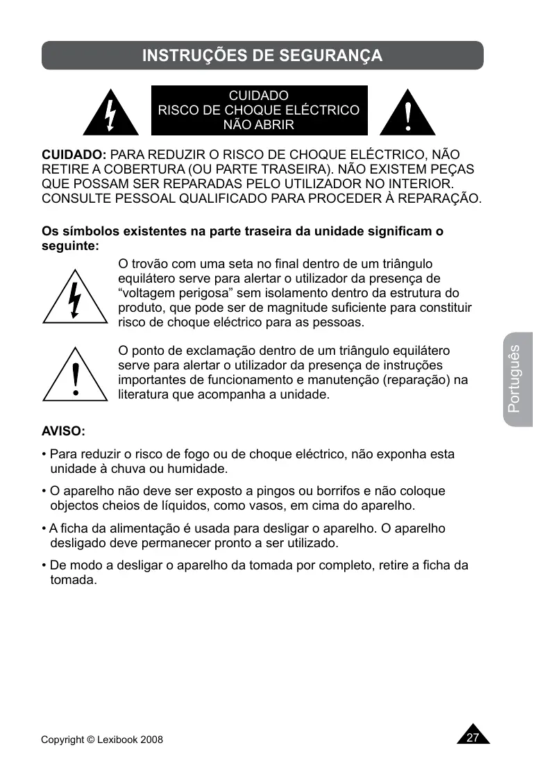 - Para reduzir o risco de fogo ou deCHOque elctrico, nao exponha esta unidade a chuva ou humidade.