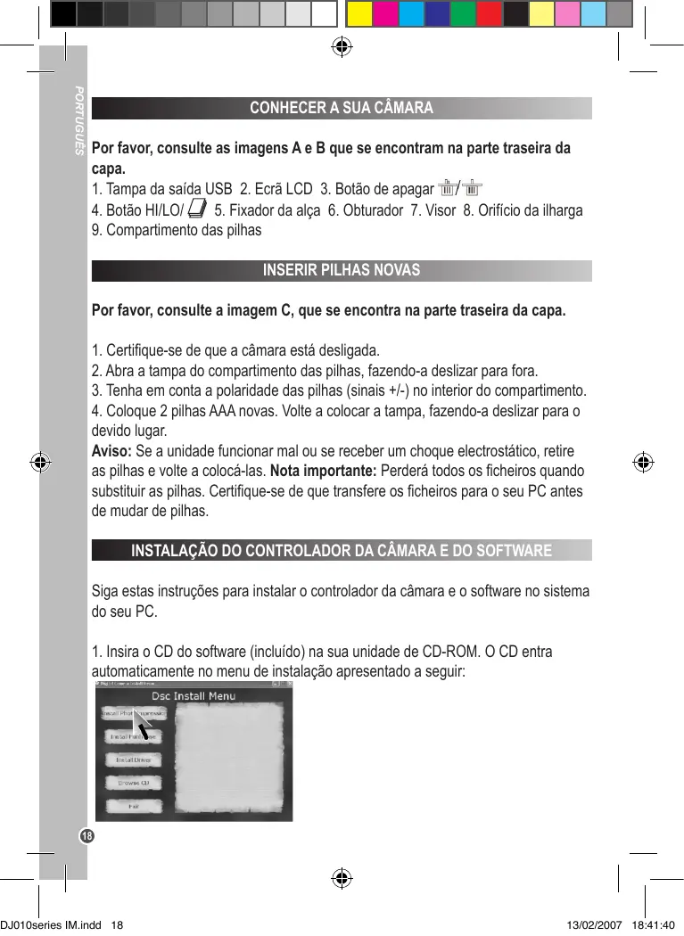 DJ010series IM.indd 18 13/02/2007 18:41:40 PORTUGUÊS Clique em “Install driver”, e siga as instruções para o instalar. Precisa de reiniciar o seu computador após instalar o controlador. Nota: Se o CD não entrar automaticamente no menu de instalação, clique em Iniciar Executar, escreva “D:\setup.exe” na caixa de texto de Executar (em que D:\ é a sua unidade de CD-ROM). 2. Proceda do mesmo modo para instalar o software PhotoImpression e o Funhouse. O software PhotoImpression e o Funhouse oferecem muitas aplicações para a edição e impressão de fotos. Notas: - Tem de instalar o controlador antes de descarregar as imagens da câmara para o computador. - Pode clicar em “Browse CD” para ler os ficheiros de informação do software PhotoImpression e Funhouse. Se não conseguir ler os ficheiros, tem de instalar primeiro o Acrobat Reader.
