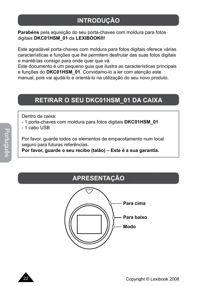 - Foram feitos todos os esforços para asseguir altos padrões de qualida para o seu DKC01HSM_01. No entanto, se algo falhar, não tente reparar a unidade sozinho. Consulte o seu revendedor ou a红线 de ajuda da LEXIBOOK®.