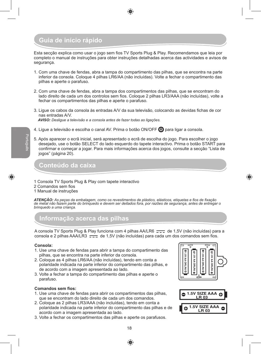 desejado, use o botão SELECT do lado esquerdo do tapete interactivo. Prima o botão START para confirmar e começar a jogar. Para mais informações acerca dos jogos, consulte a secção “Lista de jogos” (página 20). Conteúdo da caixa 1 Consola TV Sports Plug & Play com tapete interactivo 2 Comandos sem fios 1 Manual de instruções ATENÇÃO: As peças da embalagem, como os revestimentos de plástico, elásticos, etiquetas e fios de fixação de metal não fazem parte do brinquedo e devem ser deitados fora, por razões de segurança, antes de entregar o brinquedo a uma criança. Informação acerca das pilhas A consola TV Sports Plug & Play funciona com 4 pilhas AA/LR6 de 1,5V (não incluídas) para a consola e 2 pilhas AAA/LR3 de 1,5V (não incluídas) para cada um dos comandos sem fios.
