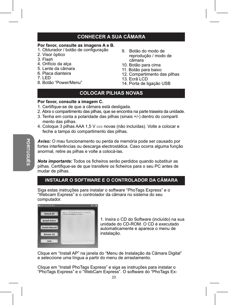 INSTALLER LES LOGICIELS ET LE PILOTE DE L’APPAREIL PHOTO Suivez ces instructions pour installer les logiciels « PhoTags Express » et « WebCam Express » ainsi que le pilote de l’appareil photo sur votre ordinateur.
