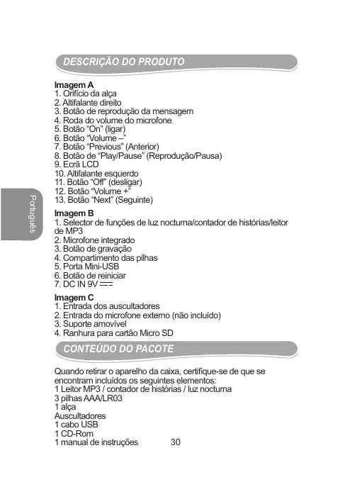 Pode uses a porta mini-USB daança para ligar o DMPJ1 ao seu computador e descarregarisas, melóidas e historias no tipo MP3 ou WAV (os ficheiros WAV tém de estar em 44.1 KHz/ 16 bits ou inferior).