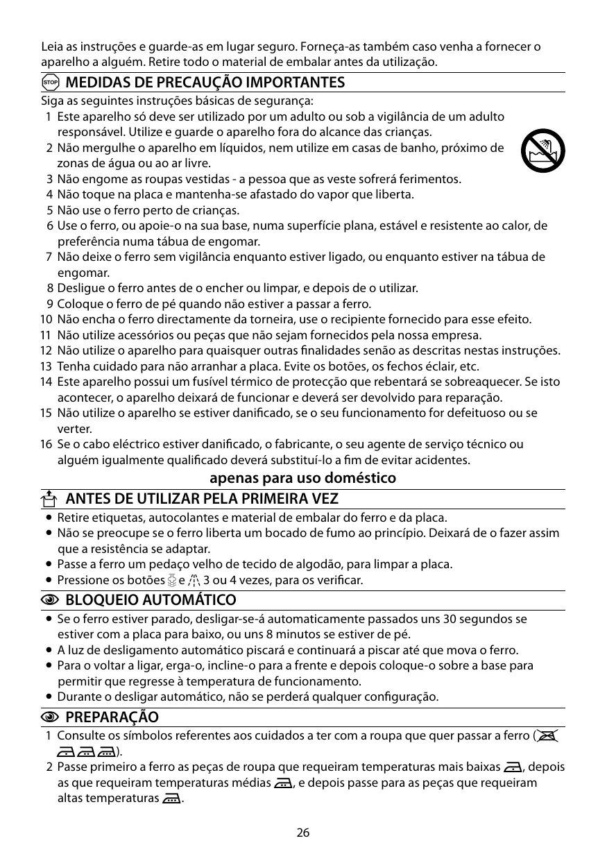 A MEDIDAS DE PRECAUÇÃO IMPORTANTES Siga as seguintes instruções básicas de segurança: 1 Este aparelho só deve ser utilizado por um adulto ou sob a vigilância de um adulto responsável. Utilize e guarde o aparelho fora do alcance das crianças. 2 Não mergulhe o aparelho em líquidos, nem utilize em casas de banho, próximo de zonas de água ou ao ar livre. 3 Não engome as roupas vestidas - a pessoa que as veste sofrerá ferimentos. 4 Não toque na placa e mantenha-se afastado do vapor que liberta. 5 Não use o ferro perto de crianças. 6 Use o ferro, ou apoie-o na sua base, numa superfície plana, estável e resistente ao calor, de preferência numa tábua de engomar. 7 Não deixe o ferro sem vigilância enquanto estiver ligado, ou enquanto estiver na tábua de engomar. 8 Desligue o ferro antes de o encher ou limpar, e depois de o utilizar. 9 Coloque o ferro de pé quando não estiver a passar a ferro. 10 Não encha o ferro directamente da torneira, use o recipiente fornecido para esse efeito. 11 Não utilize acessórios ou peças que não sejam fornecidos pela nossa empresa. 12 Não utilize o aparelho para quaisquer outras finalidades senão as descritas nestas instruções. 13 Tenha cuidado para não arranhar a placa. Evite os botões, os fechos éclair, etc. 14 Este aparelho possui um fusível térmico de protecção que rebentará se sobreaquecer. Se isto acontecer, o aparelho deixará de funcionar e deverá ser devolvido para reparação. 15 Não utilize o aparelho se estiver danificado, se o seu funcionamento for defeituoso ou se verter. 16 Se o cabo eléctrico estiver danificado, o fabricante, o seu agente de serviço técnico ou alguém igualmente qualificado deverá substituí-lo a fim de evitar acidentes.
