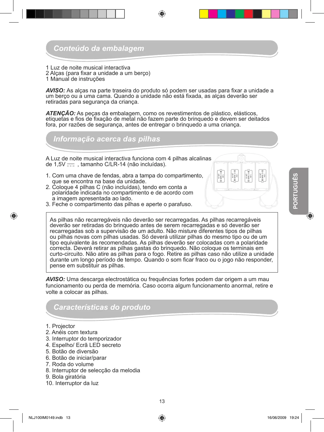 Informação acerca das pilhas A Luz de noite musical interactiva funciona com 4 pilhas alcalinas de 1,5V , tamanho C/LR-14 (não incluídas). PORTUGUÊS