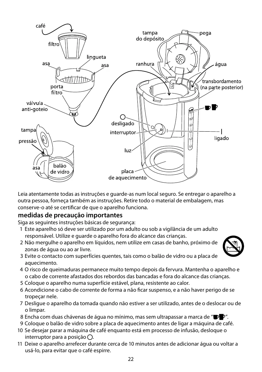 medidas de precaução importantes Siga as seguintes instruções básicas de segurança: 1 Este aparelho só deve ser utilizado por um adulto ou sob a vigilância de um adulto responsável. Utilize e guarde o aparelho fora do alcance das crianças. 2 Não mergulhe o aparelho em líquidos, nem utilize em casas de banho, próximo de zonas de água ou ao ar livre. 3 Evite o contacto com superfícies quentes, tais como o balão de vidro ou a placa de aquecimento. 4 O risco de queimaduras permanece muito tempo depois da fervura. Mantenha o aparelho e o cabo de corrente afastados dos rebordos das bancadas e fora do alcance das crianças. 5 Coloque o aparelho numa superfície estável, plana, resistente ao calor. 6 Acondicione o cabo de corrente de forma a não ficar suspenso, e a não haver perigo de se tropeçar nele. 7 Desligue o aparelho da tomada quando não estiver a ser utilizado, antes de o deslocar ou de o limpar. 8 Encha com duas chávenas de água no mínimo, mas sem ultrapassar a marca de “;:”. 9 Coloque o balão de vidro sobre a placa de aquecimento antes de ligar a máquina de café. 10 Se desejar parar a máquina de café enquanto está em processo de infusão, desloque o interruptor para a posição 0. 11 Deixe o aparelho arrefecer durante cerca de 10 minutos antes de adicionar água ou voltar a usá-lo, para evitar que o café espirre. 22