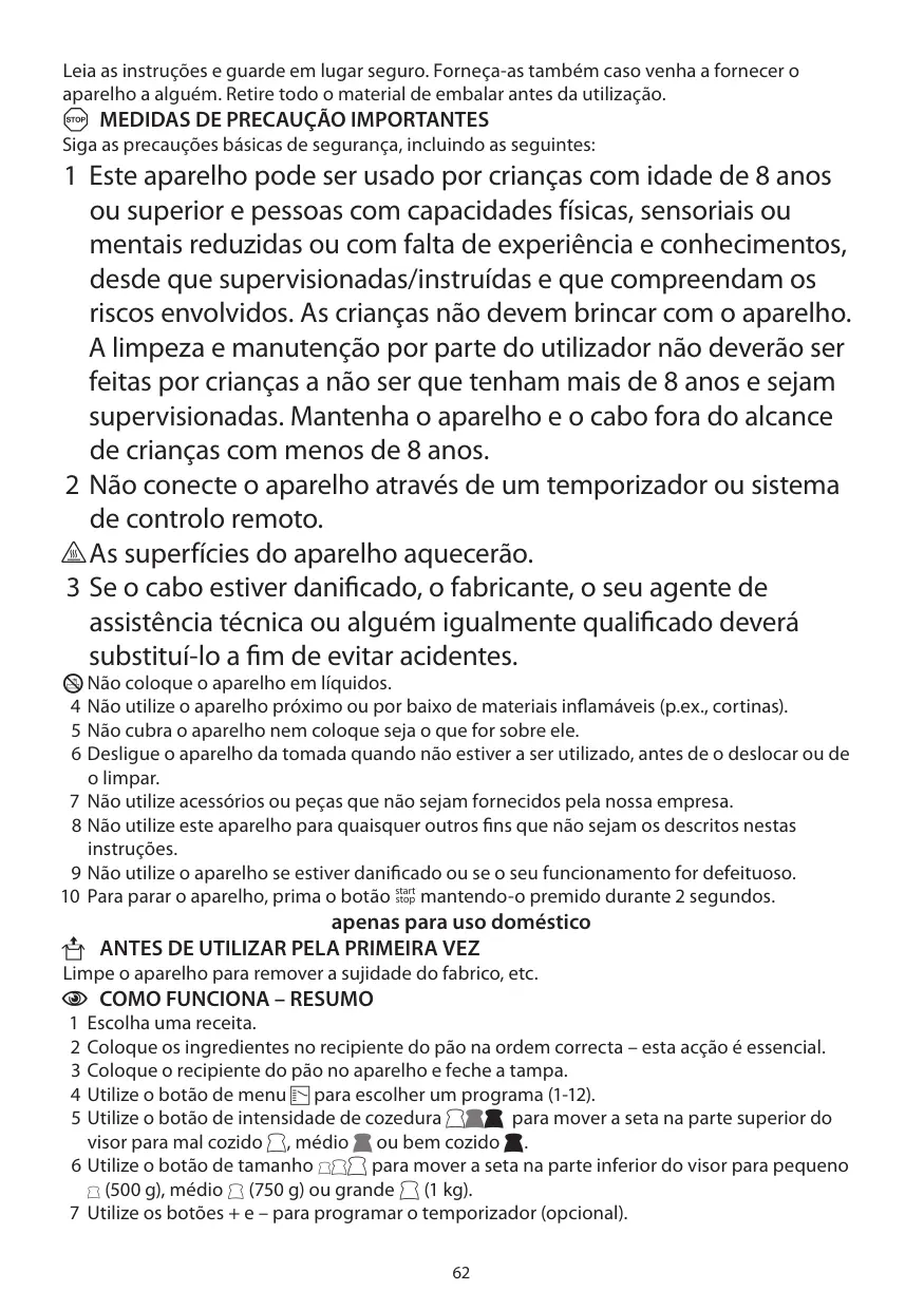 1 Este aparelho pode ser usado por crianças com idade de 8 anos ou superior e pessoas com capacidades físicas, sensoriais ou mentais reduzidas ou com falta de experiência e conhecimentos, desde que supervisionadas/instruídas e que compreendam os riscos envolvidos. As crianças não devem brincar com o aparelho. A limpeza e manutenção por parte do utilizador não deverão ser feitas por crianças a não ser que tenham mais de 8 anos e sejam supervisionadas. Mantenha o aparelho e o cabo fora do alcance de crianças com menos de 8 anos. 2 Não conecte o aparelho através de um temporizador ou sistema de controlo remoto. ¬ As superfícies do aparelho aquecerão. 3 Se o cabo estiver danificado, o fabricante, o seu agente de assistência técnica ou alguém igualmente qualificado deverá substituí-lo a fim de evitar acidentes.