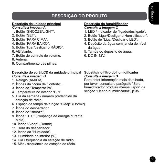 Descrição do ecrã LCD da unidade principal Substituir o filtro do humidificador Consulte a imagem B Consulte a imagem D Para obter informação mais detalhada,