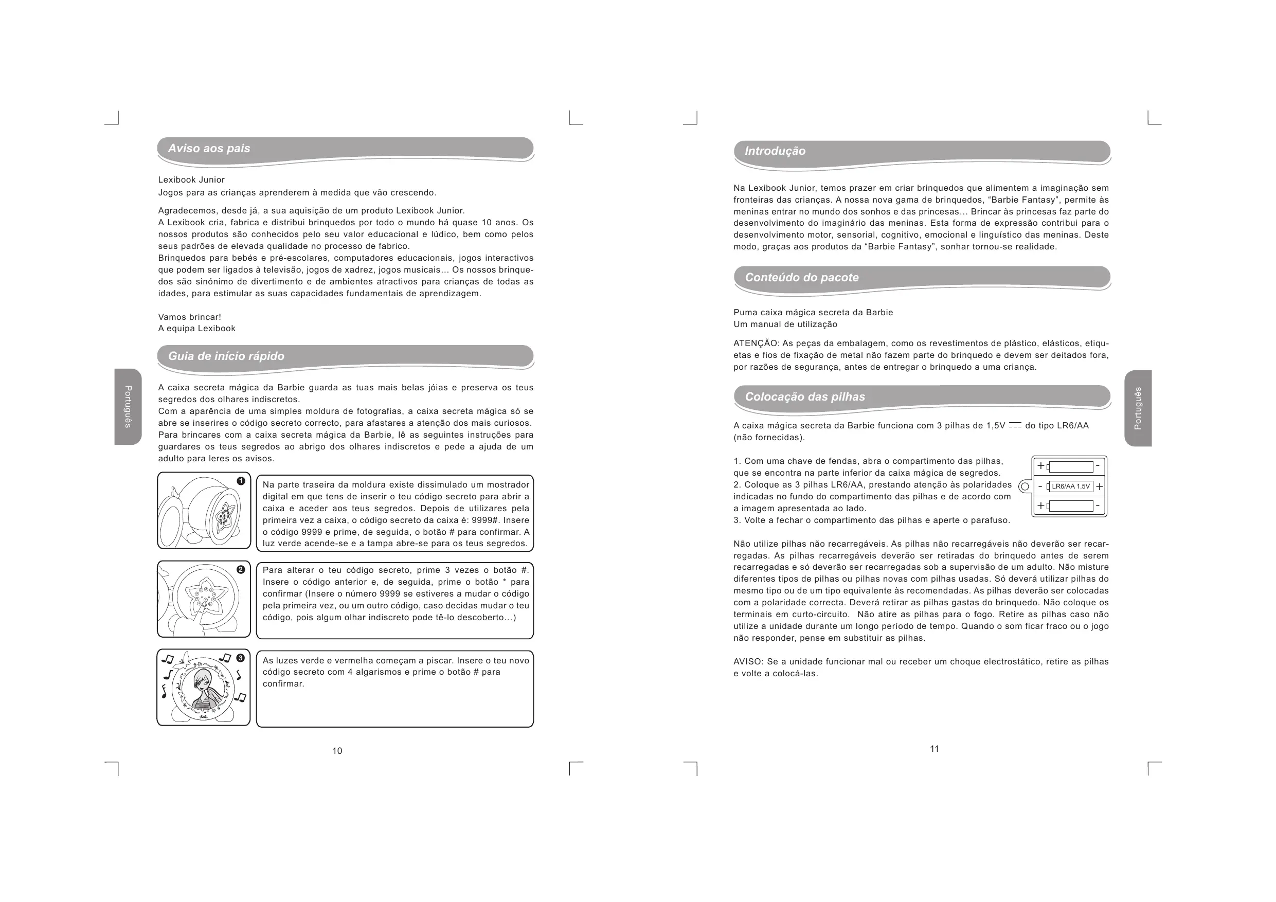 Na Lexibook Junior, temos prazer em criar brinquedos que alimentem a imaginação sem fronteiras das crianças. A nossa nova gama de brinquedos, “Barbie Fantasy”, permite às meninas entrar no mundo dos sonhos e das princesas… Brincar às princesas faz parte do desenvolvimento do imaginário das meninas. Esta forma de expressão contribui para o desenvolvimento motor, sensorial, cognitivo, emocional e linguístico das meninas. Deste modo, graças aos produtos da “Barbie Fantasy”, sonhar tornou-se realidade. Colocação das pilhas A caixa mágica secreta da Barbie funciona com 3 pilhas de 1,5V (não fornecidas).
