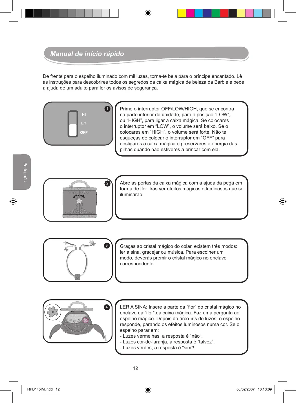 RPB1IM.indd 11 0/02/200 10:1:0 Manual de início rápido De frente para o espelho iluminado com mil luzes, torna-te bela para o príncipe encantado. Lê as instruções para descobrires todos os segredos da caixa mágica de beleza da Barbie e pede a ajuda de um adulto para ler os avisos de segurança. Português