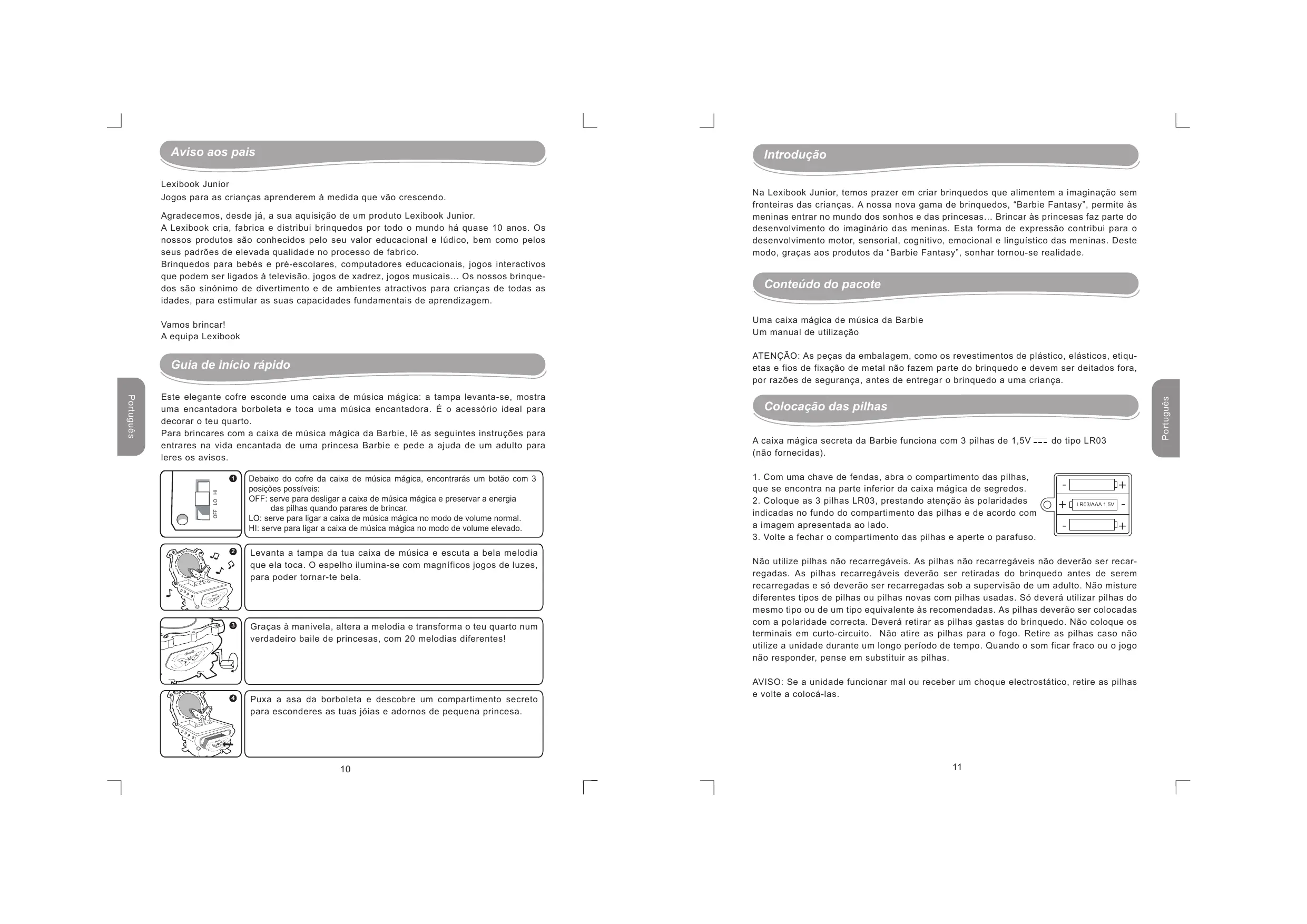 Na Lexibook Junior, temos prazer em criar brinquedos que alimentem a imaginação sem fronteiras das crianças. A nossa nova gama de brinquedos, “Barbie Fantasy”, permite às meninas entrar no mundo dos sonhos e das princesas… Brincar às princesas faz parte do desenvolvimento do imaginário das meninas. Esta forma de expressão contribui para o desenvolvimento motor, sensorial, cognitivo, emocional e linguístico das meninas. Deste modo, graças aos produtos da “Barbie Fantasy”, sonhar tornou-se realidade. Não utilize pilhas não recarregáveis. As pilhas não recarregáveis não deverão ser recarregadas. As pilhas recarregáveis deverão ser retiradas do brinquedo antes de serem recarregadas e só deverão ser recarregadas sob a supervisão de um adulto. Não misture diferentes tipos de pilhas ou pilhas novas com pilhas usadas. Só deverá utilizar pilhas do mesmo tipo ou de um tipo equivalente às recomendadas. As pilhas deverão ser colocadas com a polaridade correcta. Deverá retirar as pilhas gastas do brinquedo. Não coloque os terminais em curto-circuito. Não atire as pilhas para o fogo. Retire as pilhas caso não utilize a unidade durante um longo período de tempo. Quando o som ficar fraco ou o jogo não responder, pense em substituir as pilhas. AVISO: Se a unidade funcionar mal ou receber um choque electrostático, retire as pilhas e volte a colocá-las.