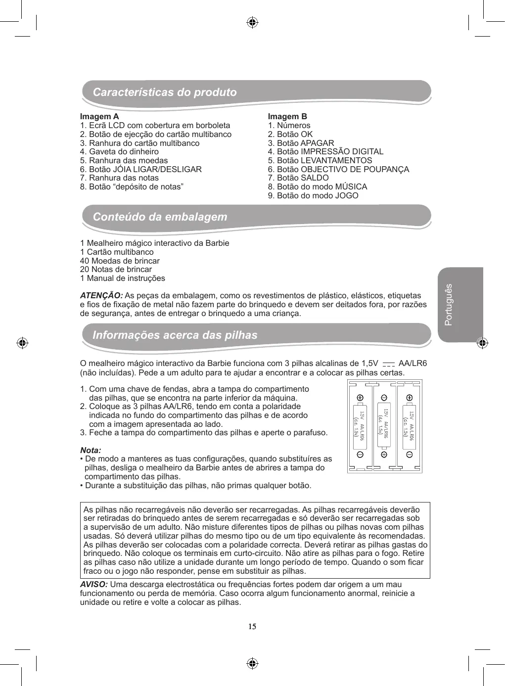 Conteúdo da embalagem ATENÇÃO: As peças da embalagem, como os revestimentos de plástico, elásticos, etiquetas e fios de fixação de metal não fazem parte do brinquedo e devem ser deitados fora, por razões de segurança, antes de entregar o brinquedo a uma criança. Informações acerca das pilhas O mealheiro mágico interactivo da Barbie funciona com 3 pilhas alcalinas de 1,5V AA/LR6 (não incluídas). Pede a um adulto para te ajudar a encontrar e a colocar as pilhas certas.