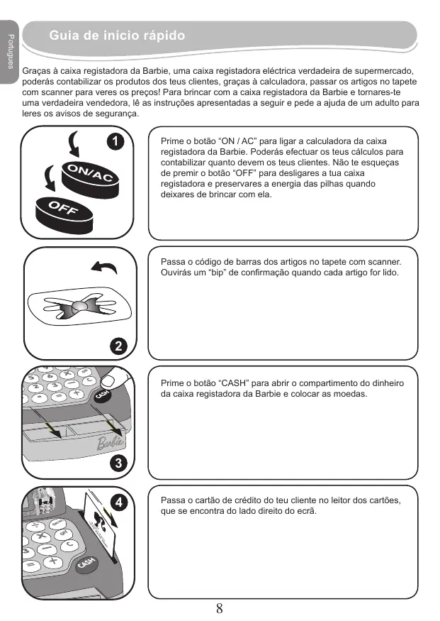 English Maintenance and Warranty Portugues Guia de início rápido Graças à caixa registadora da Barbie, uma caixa registadora eléctrica verdadeira de supermercado, poderás contabilizar os produtos dos teus clientes, graças à calculadora, passar os artigos no tapete com scanner para veres os preços! Para brincar com a caixa registadora da Barbie e tornares-te uma verdadeira vendedora, lê as instruções apresentadas a seguir e pede a ajuda de um adulto para leres os avisos de segurança.