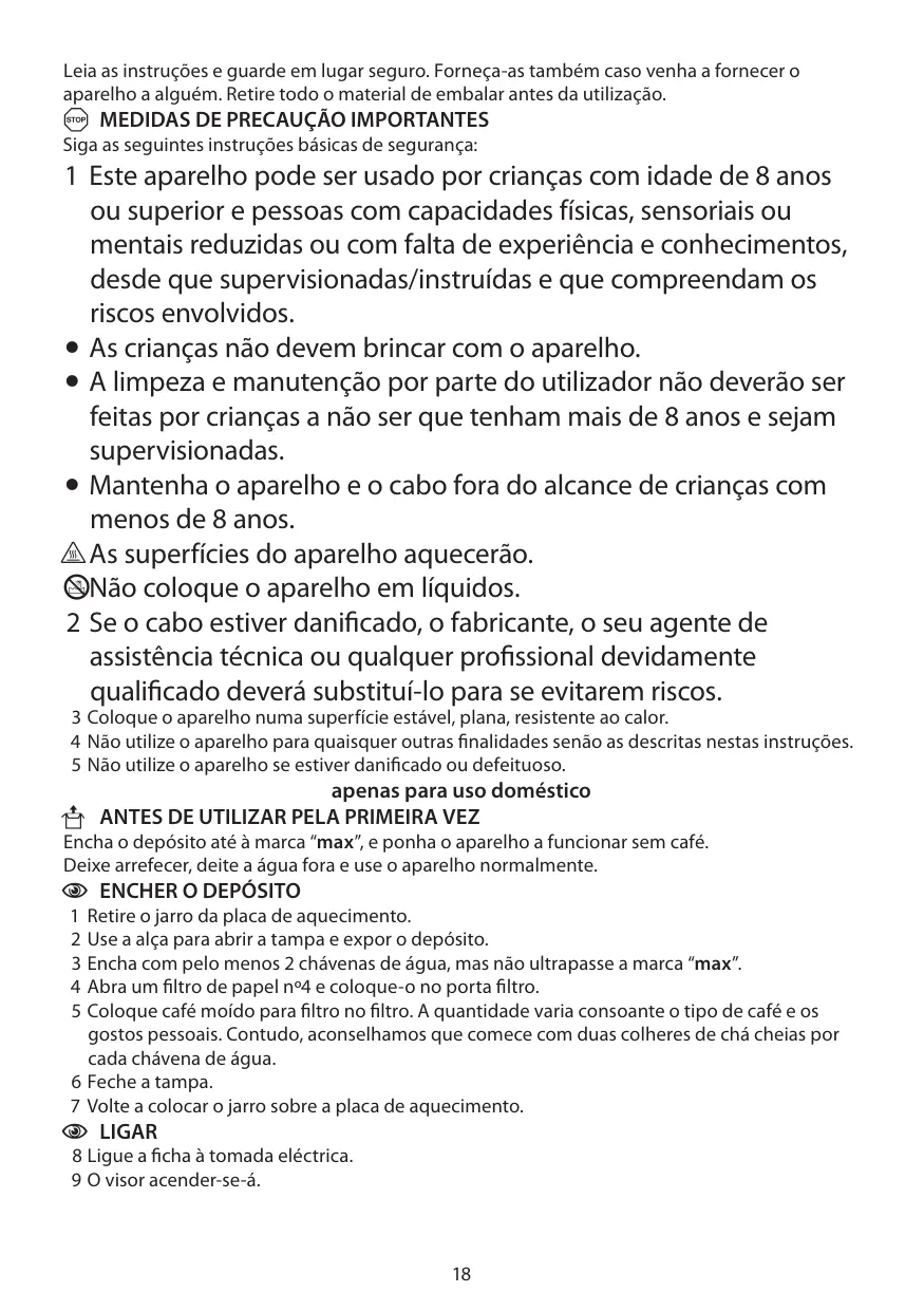 - Mantenha o aparelho e o cabo fora do alcance de crianças com menos de 8 anos. h As superfícies do aparelho aquecerão. lNão coloque o aparelho em líquidos. 2 Se o cabo estiver danificado, o fabricante, o seu agente de assistência técnica ou qualquer profissional devidamente qualificado deverá substituí-lo para se evitarem riscos. 3 Coloque o aparelho numa superfície estável, plana, resistente ao calor. 4 Não utilize o aparelho para quaisquer outras finalidades senão as descritas nestas instruções. 5 Não utilize o aparelho se estiver danificado ou defeituoso. apenas para uso doméstico U ANTES DE UTILIZAR PELA PRIMEIRA VEZ Encha o depósito até à marca “max”, e ponha o aparelho a funcionar sem café. Deixe arrefecer, deite a água fora e use o aparelho normalmente.