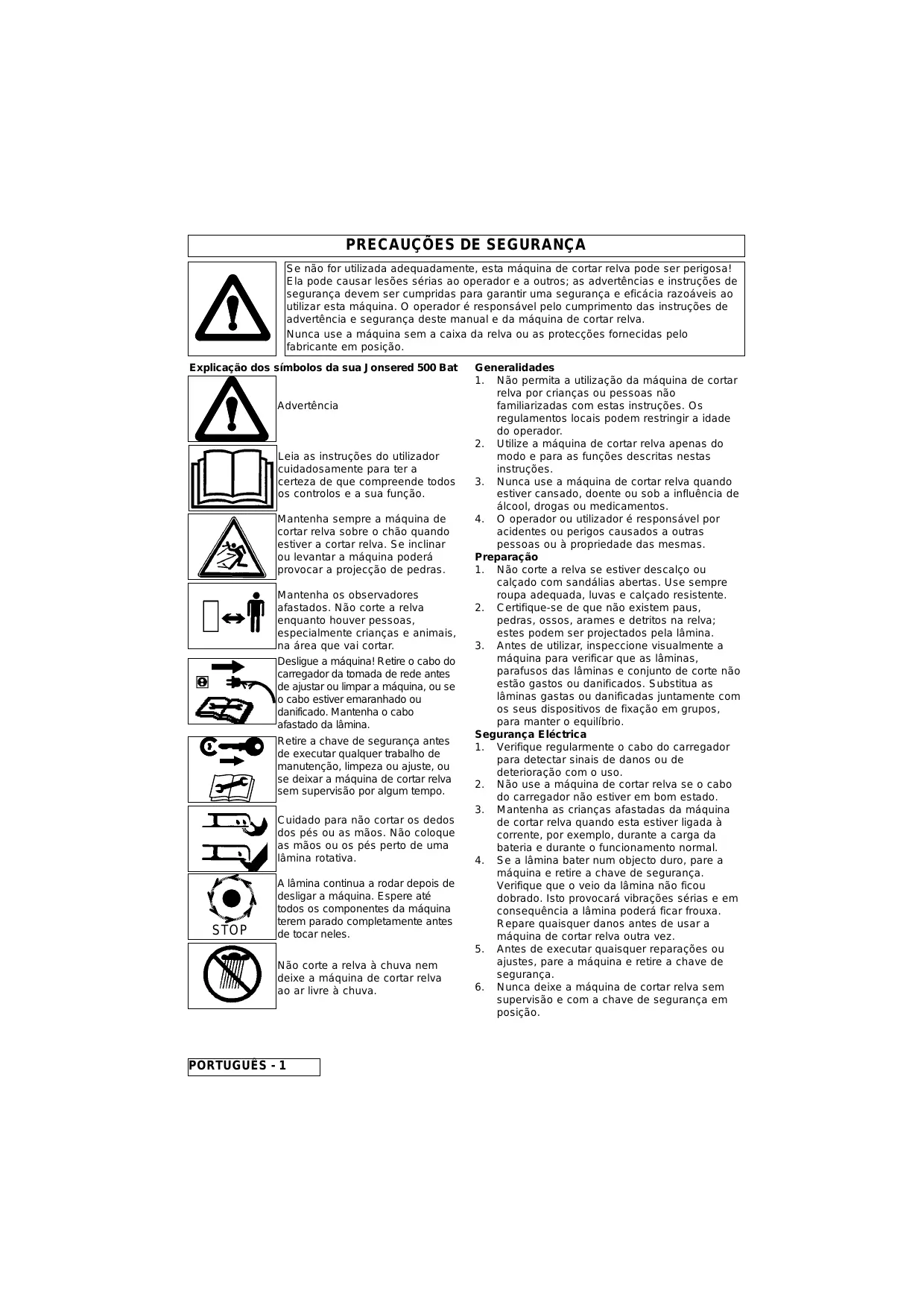 1. 7. Etiqueta de Aviso 8. Controlo de Presença do Operador I 1. 2. Veuillez respecter les avertissements et les instructions de sécurité pour assurer le rendement et la sécurité de la tondeuse. Il incombe à l’utilisateur de respecter les avertissements et les instructions de sécurité figurant dans le présent manuel et sur la tondeuse. Ne jamais utiliser la tondeuse si le bac ou les protections fournies par le fabricant ne sont pas en place. Explication des symboles de la tondeuse Jonsered 500 Bat