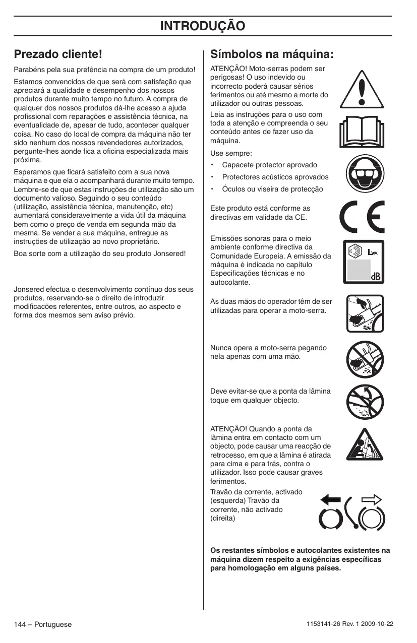 Estamos convencidos de que será com satisfação que apreciará a qualidade e desempenho dos nossos produtos durante muito tempo no futuro. A compra de qualquer dos nossos produtos dá-lhe acesso a ajuda profissional com reparações e assistência técnica, na eventualidade de, apesar de tudo, acontecer qualquer coisa. No caso do local de compra da máquina não ter sido nenhum dos nossos revendedores autorizados, pergunte-lhes aonde fica a oficina especializada mais próxima. Esperamos que ficará satisfeito com a sua nova máquina e que ela o acompanhará durante muito tempo. Lembre-se de que estas instruções de utilização são um documento valioso. Seguindo o seu conteúdo (utilização, assistência técnica, manutenção, etc) aumentará consideravelmente a vida útil da máquina bem como o preço de venda em segunda mão da mesma. Se vender a sua máquina, entregue as instruções de utilização ao novo proprietário. Boa sorte com a utilização do seu produto Jonsered!