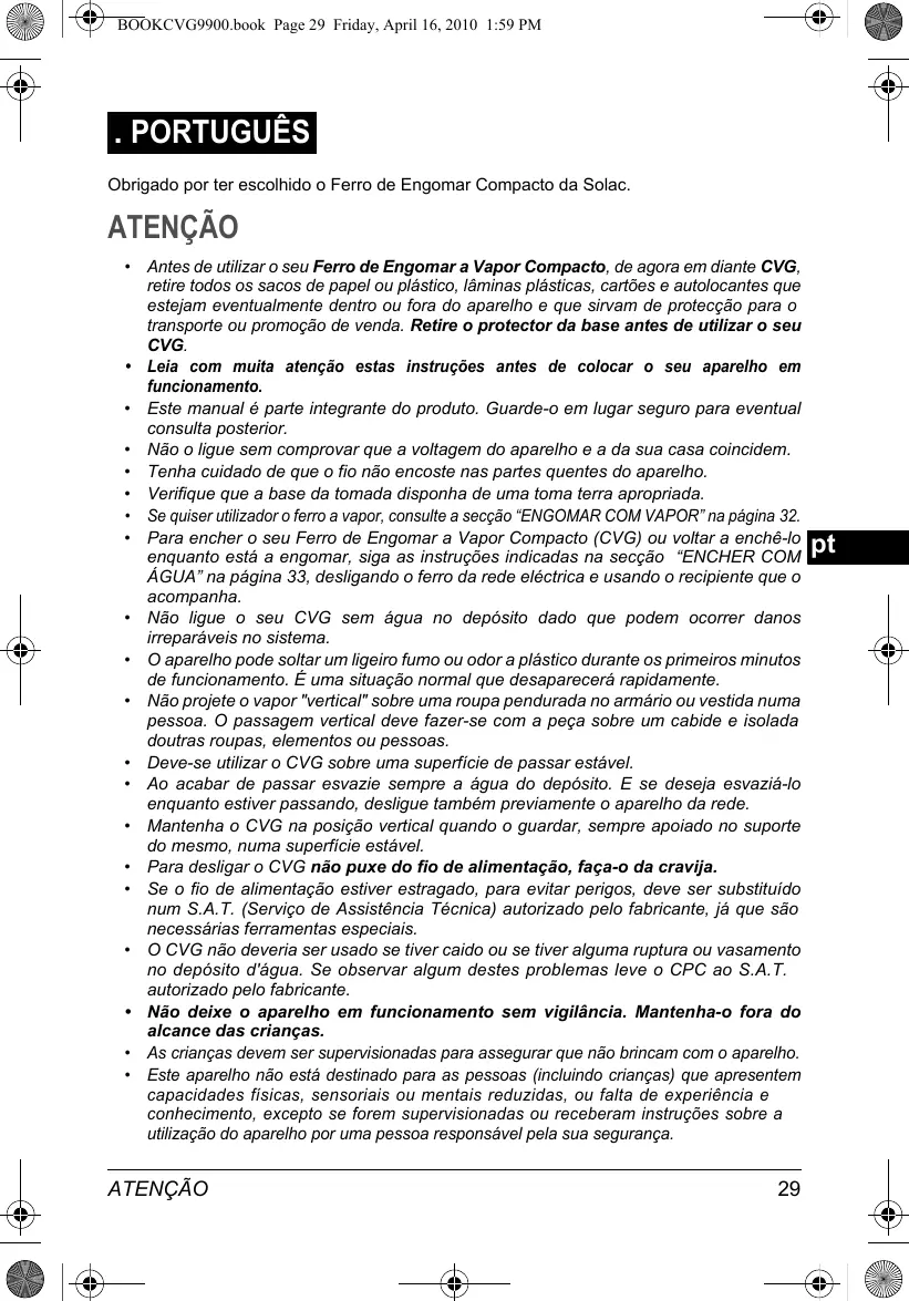 ANDERE FUNKTIONEN BOOKCVG9900.book Page 29 Friday, April 16, 2010 1:59 PM . PORTUGUÊS Obrigado por ter escolhido o Ferro de Engomar Compacto da Solac. ATENÇÃO