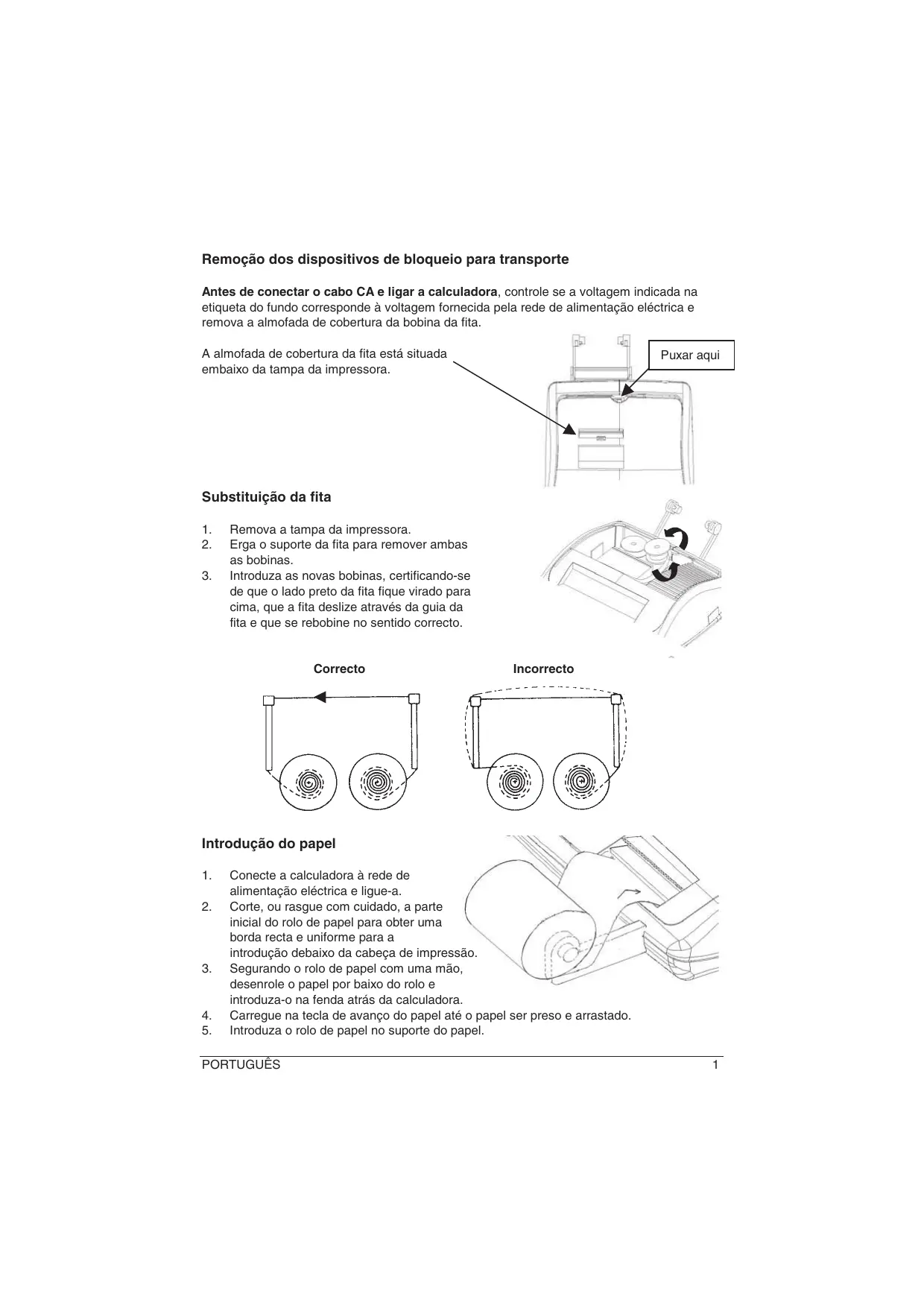 Remoção dos dispositivos de bloqueio para transporte Antes de conectar o cabo CA e ligar a calculadora, controle se a voltagem indicada na etiqueta do fundo corresponde à voltagem fornecida pela rede de alimentação eléctrica e remova a almofada de cobertura da bobina da fita. A almofada de cobertura da fita está situada embaixo da tampa da impressora. Puxar aqui Substituição da fita