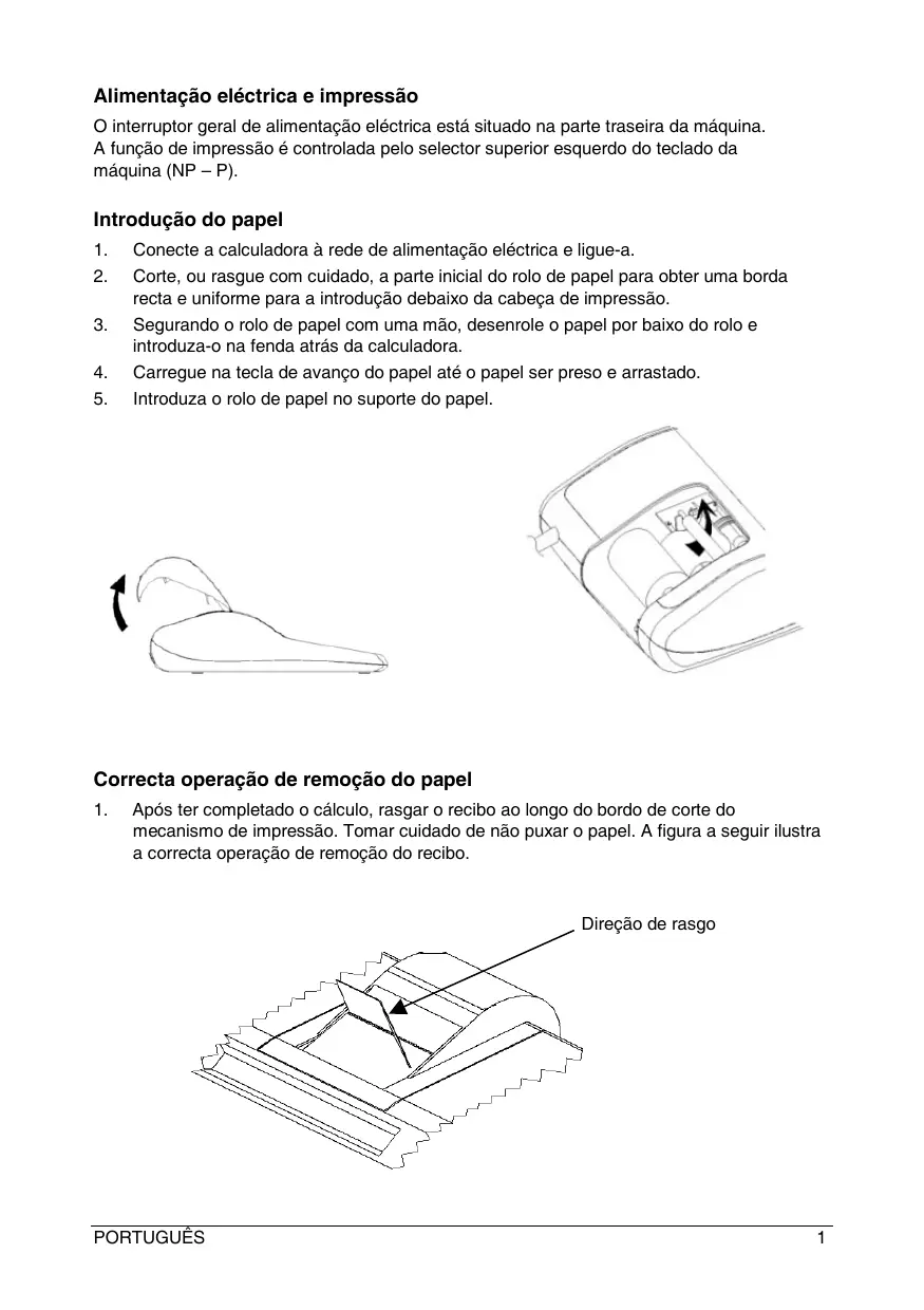 Conecte a calculadora à rede de alimentação eléctrica e ligue-a. Corte, ou rasgue com cuidado, a parte inicial do rolo de papel para obter uma borda recta e uniforme para a introdução debaixo da cabeça de impressão. Segurando o rolo de papel com uma mão, desenrole o papel por baixo do rolo e introduza-o na fenda atrás da calculadora. Carregue na tecla de avanço do papel até o papel ser preso e arrastado. Introduza o rolo de papel no suporte do papel. Correcta operação de remoção do papel