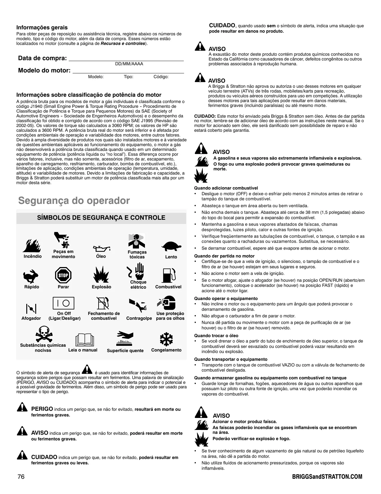 + Se tiver conhecimento de algum vazamento de gâs natural ou de petréleo liquefeito na ârea, nâo dé a partida do motor. + Näo utilze fluidos de acionamento pressurizados, porque os vapores säo inflamäveis. BRIGGSandSTRATTON.COM